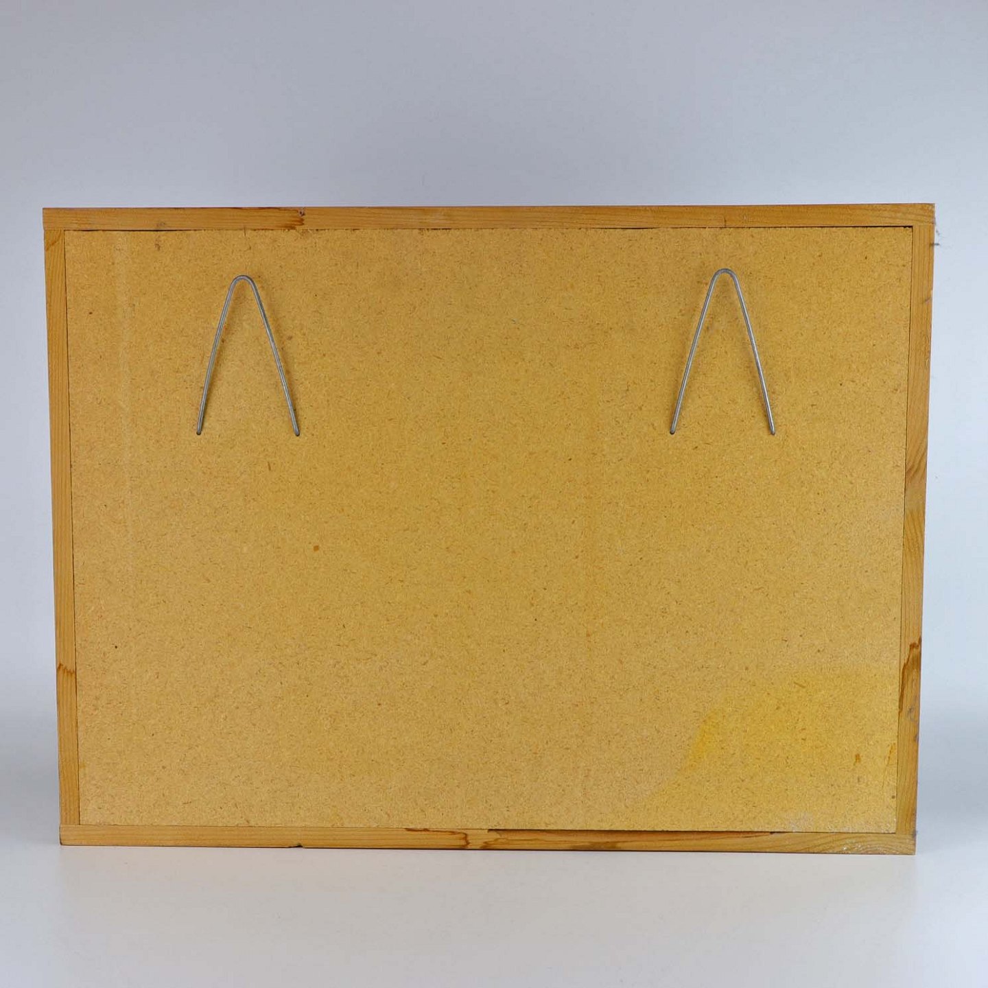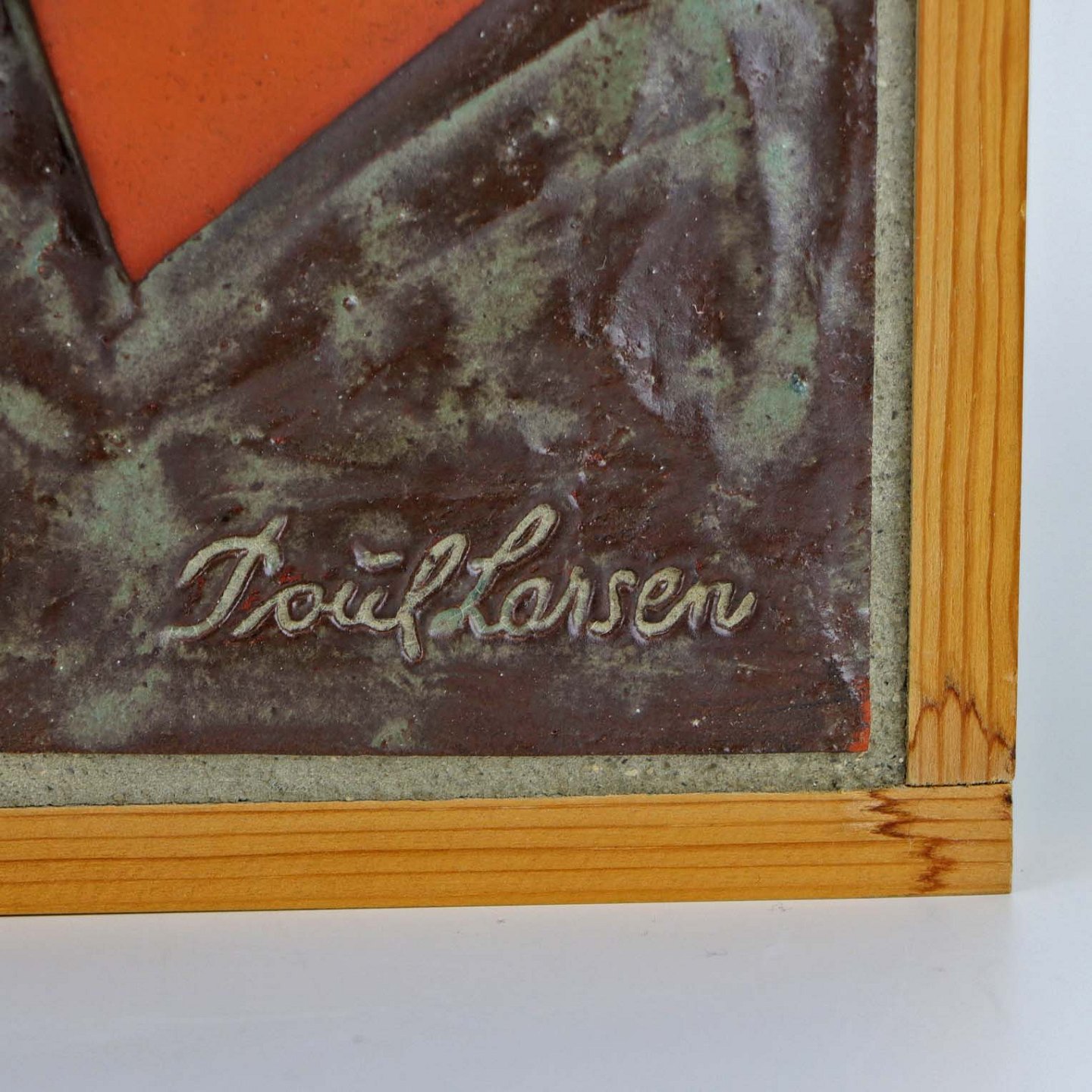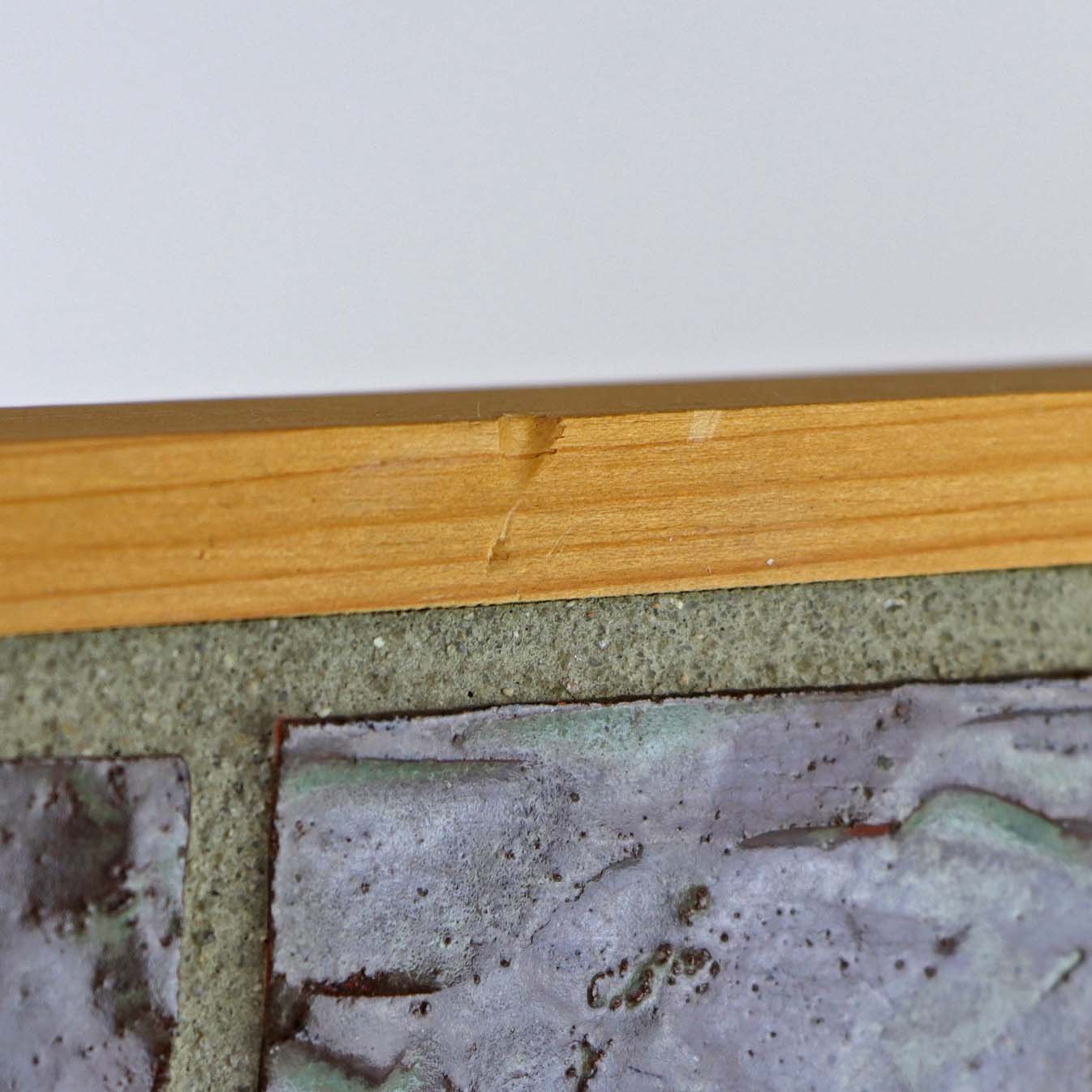 Relief i stentøj omgivet af træramme i fyrtræ med motiv af hvide, orange og grønne høns på brun baggrund