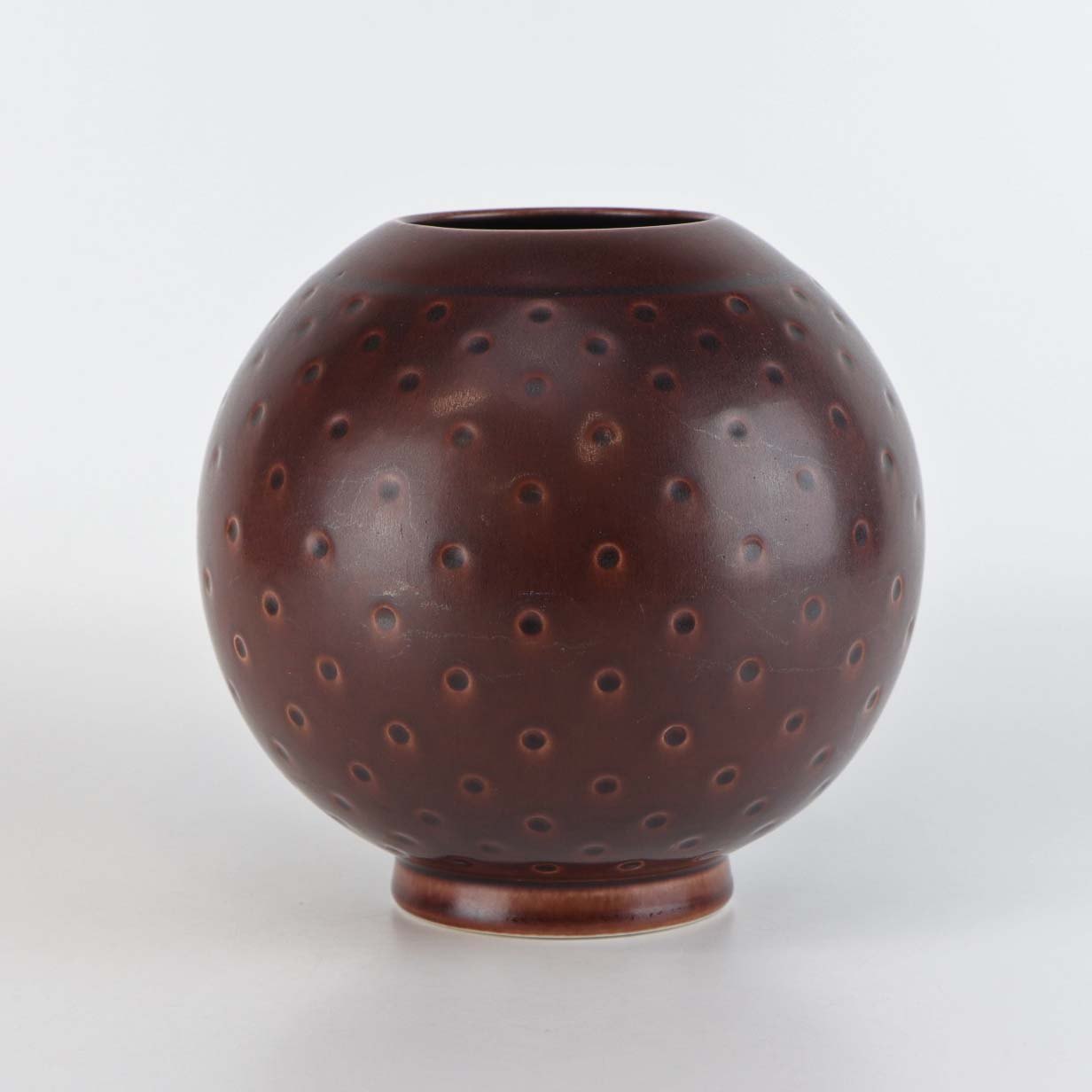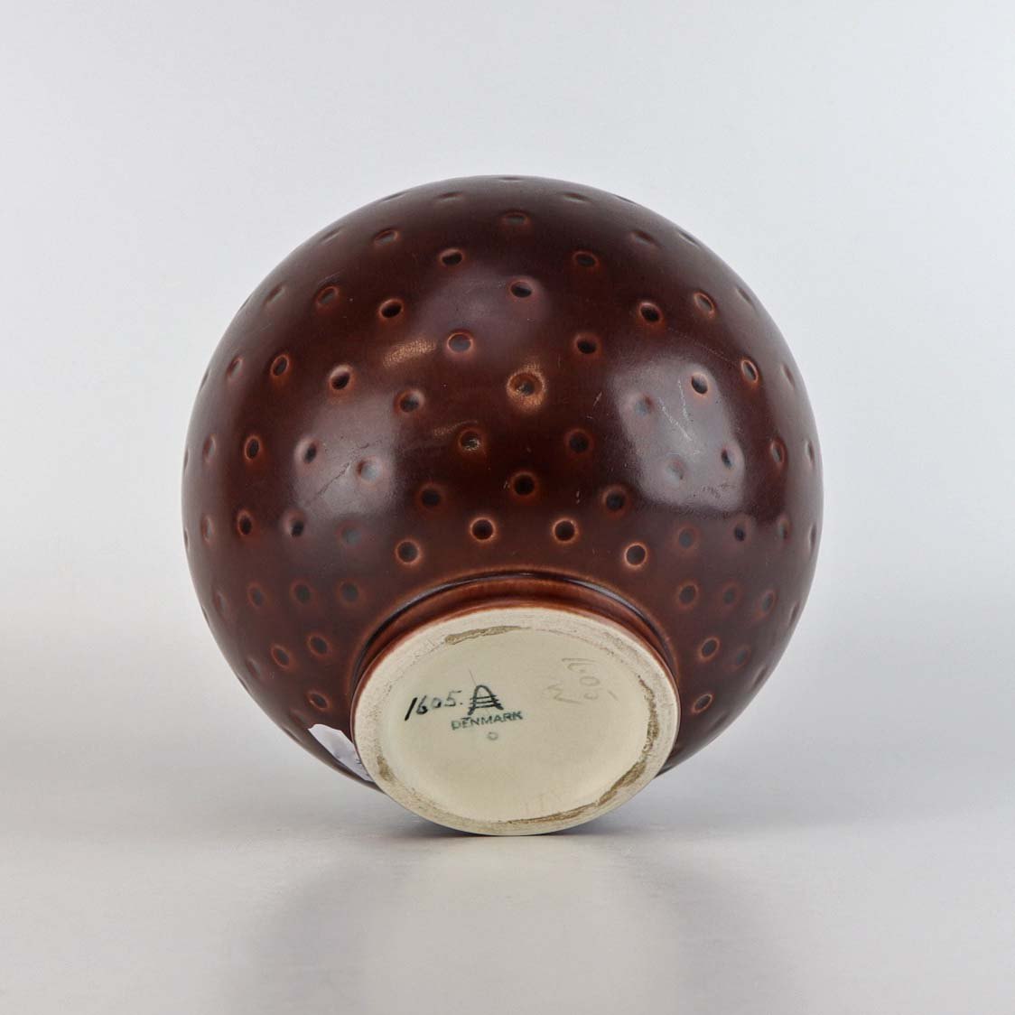 Rund kugleformet Solbjerg vase i brun fajance med enkelt prikformet mønster. Nr. 1605