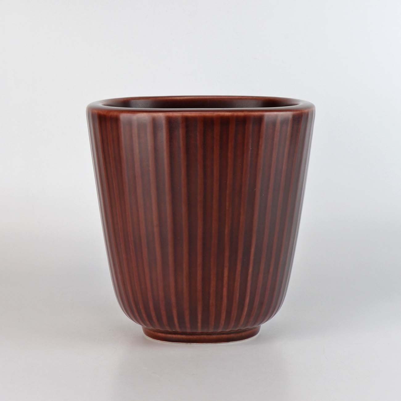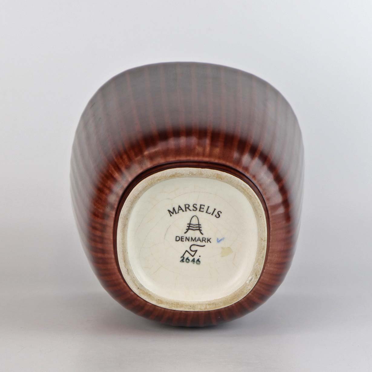 Kantet Marselis vase i rødbrun fajance med rillet mønster. Nr. 2646