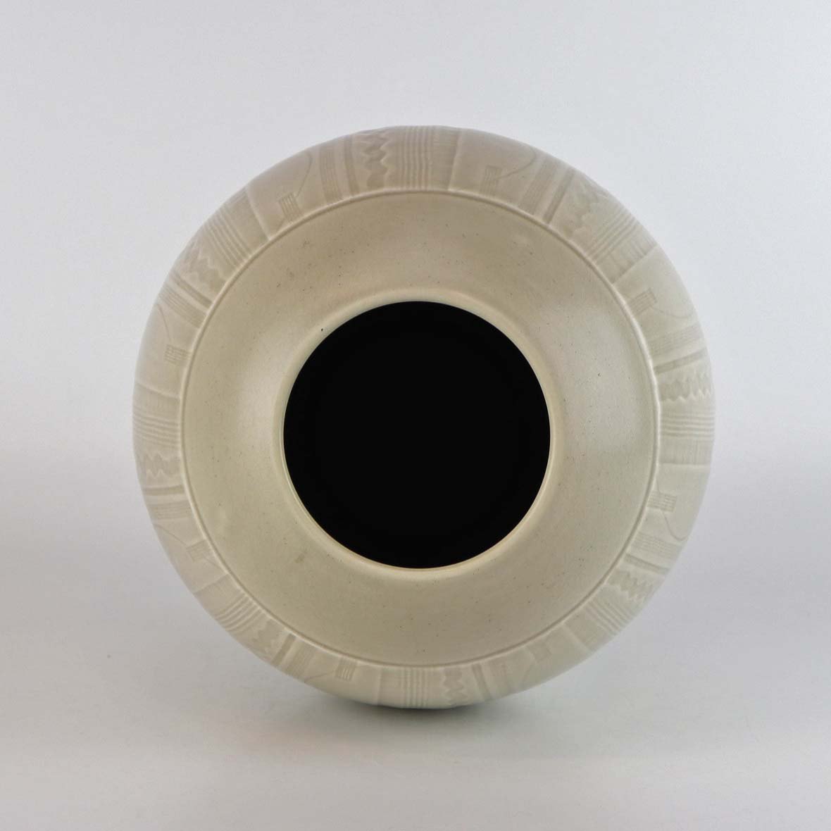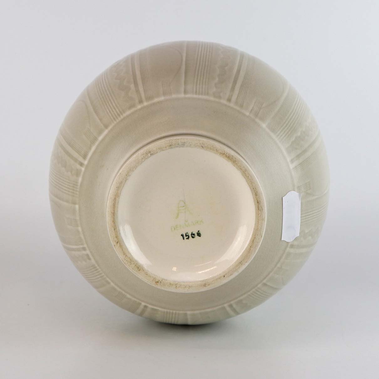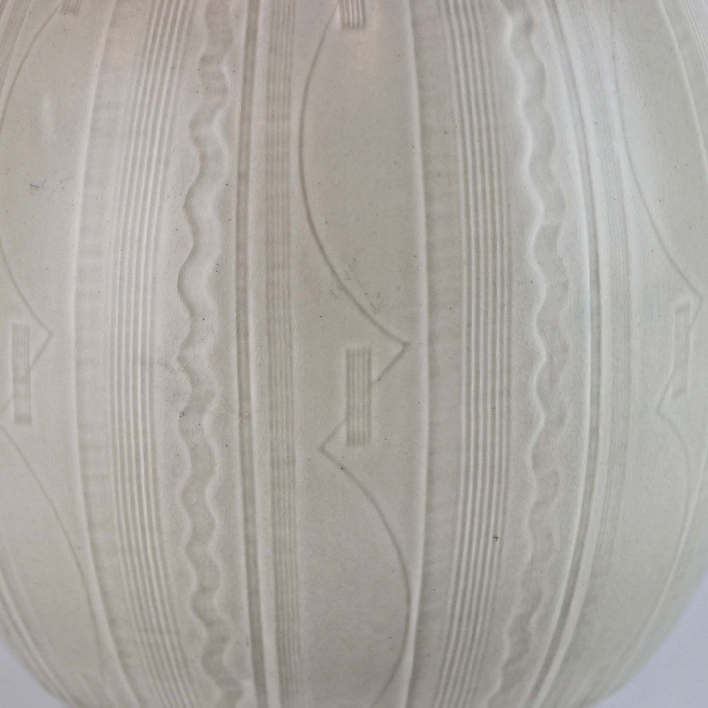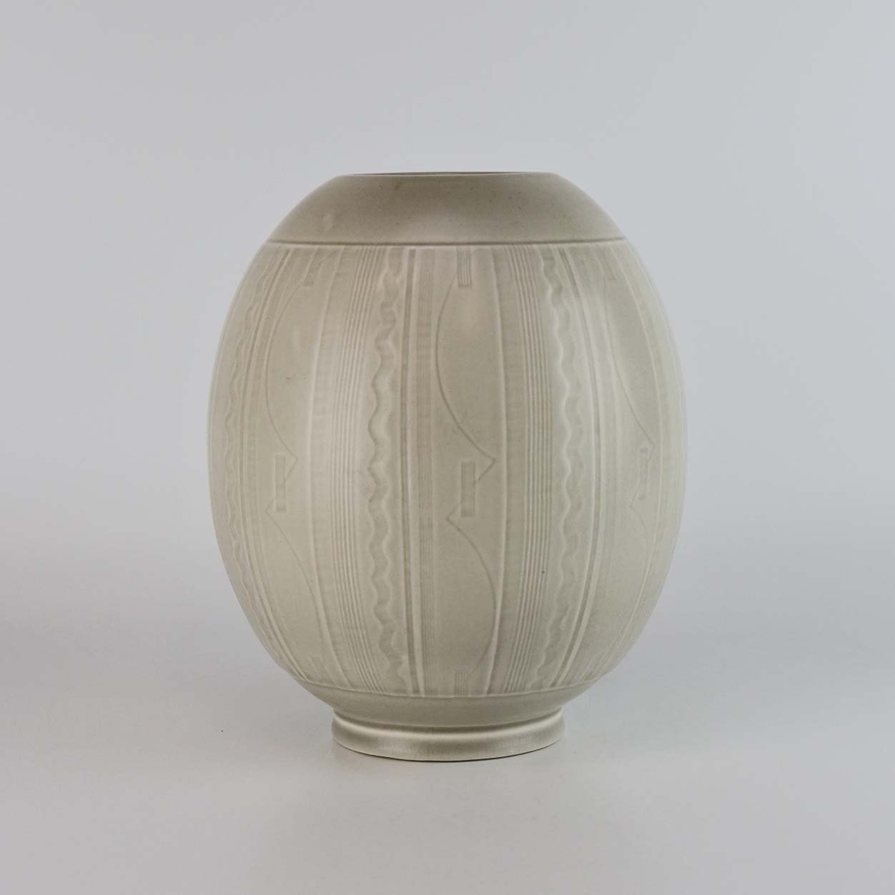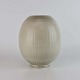 Æggeformet vase i fajance med råhvid glasur og dekoreret med stribet og bølget mønster. Nr. 1564