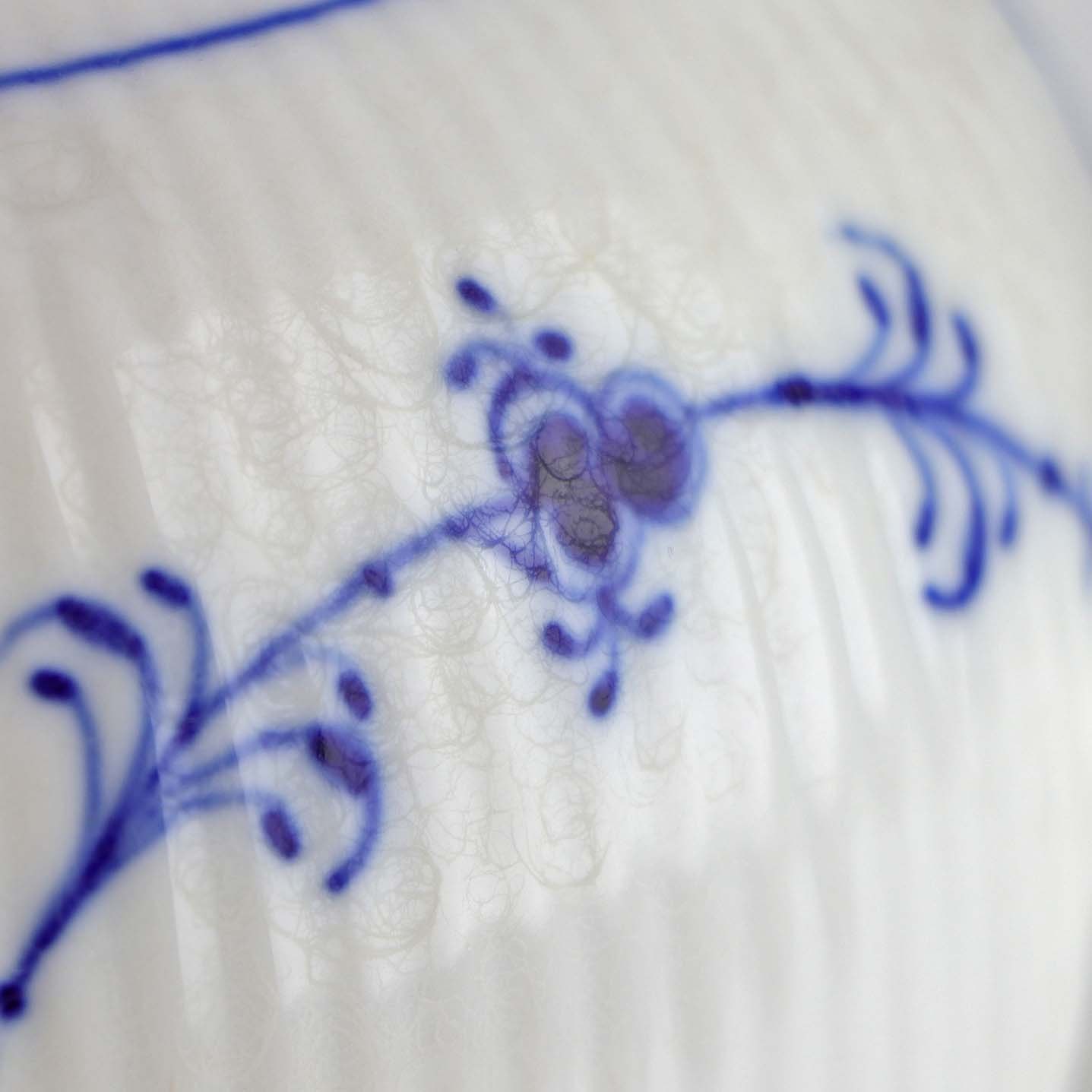 Musselmalet er af kongeligt hvidt porcelæn, dekoreret med rifler og mønster af blå ranker og blomster