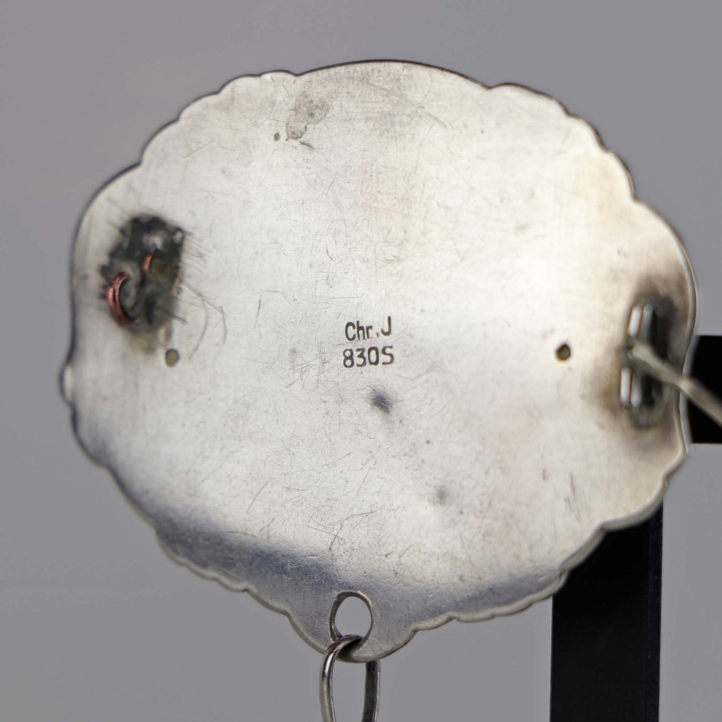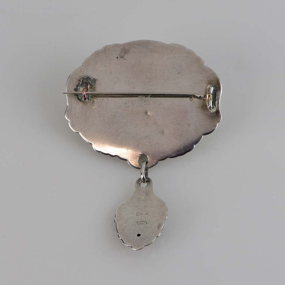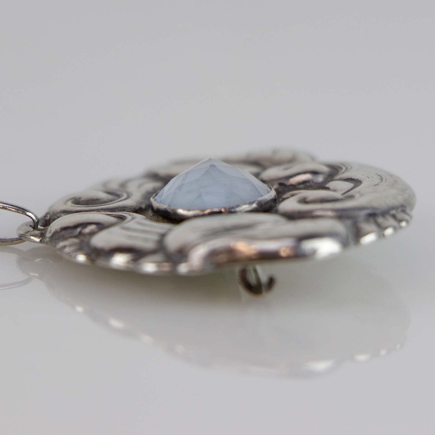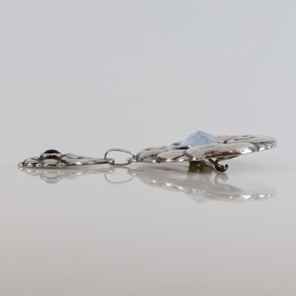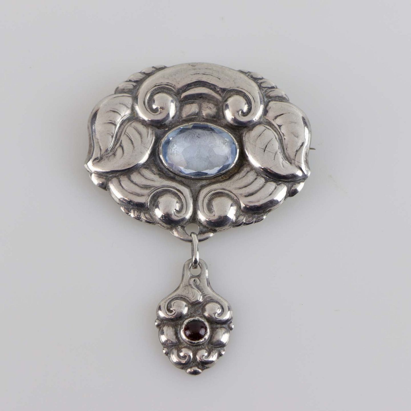 Broche i sølv udformet i skønvirke stil dekoreret med lyseblå og rød sten