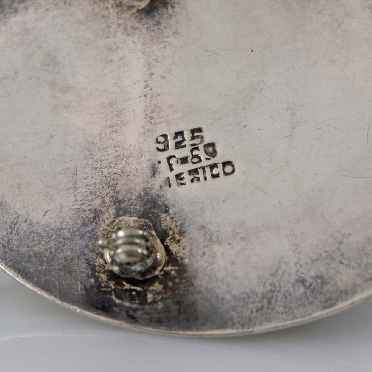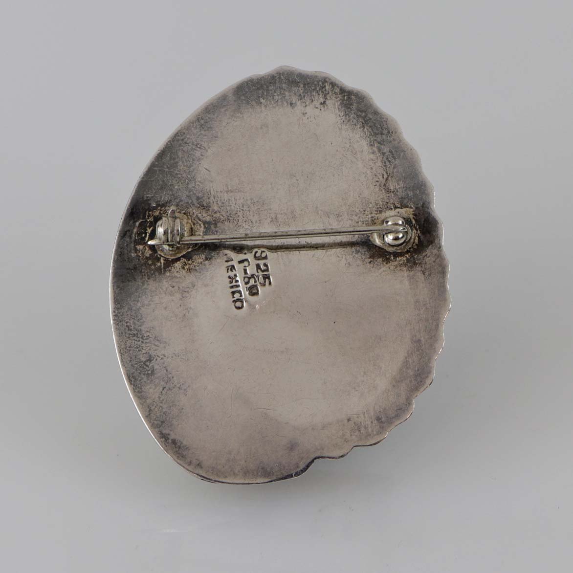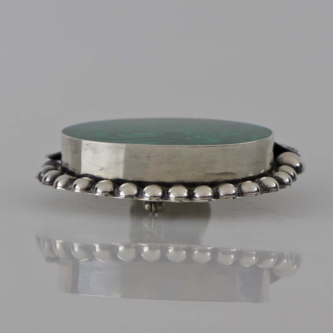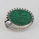 Oval mexicansk broche i sterling sølv dekoreret med grøn malakit samt blad motiv