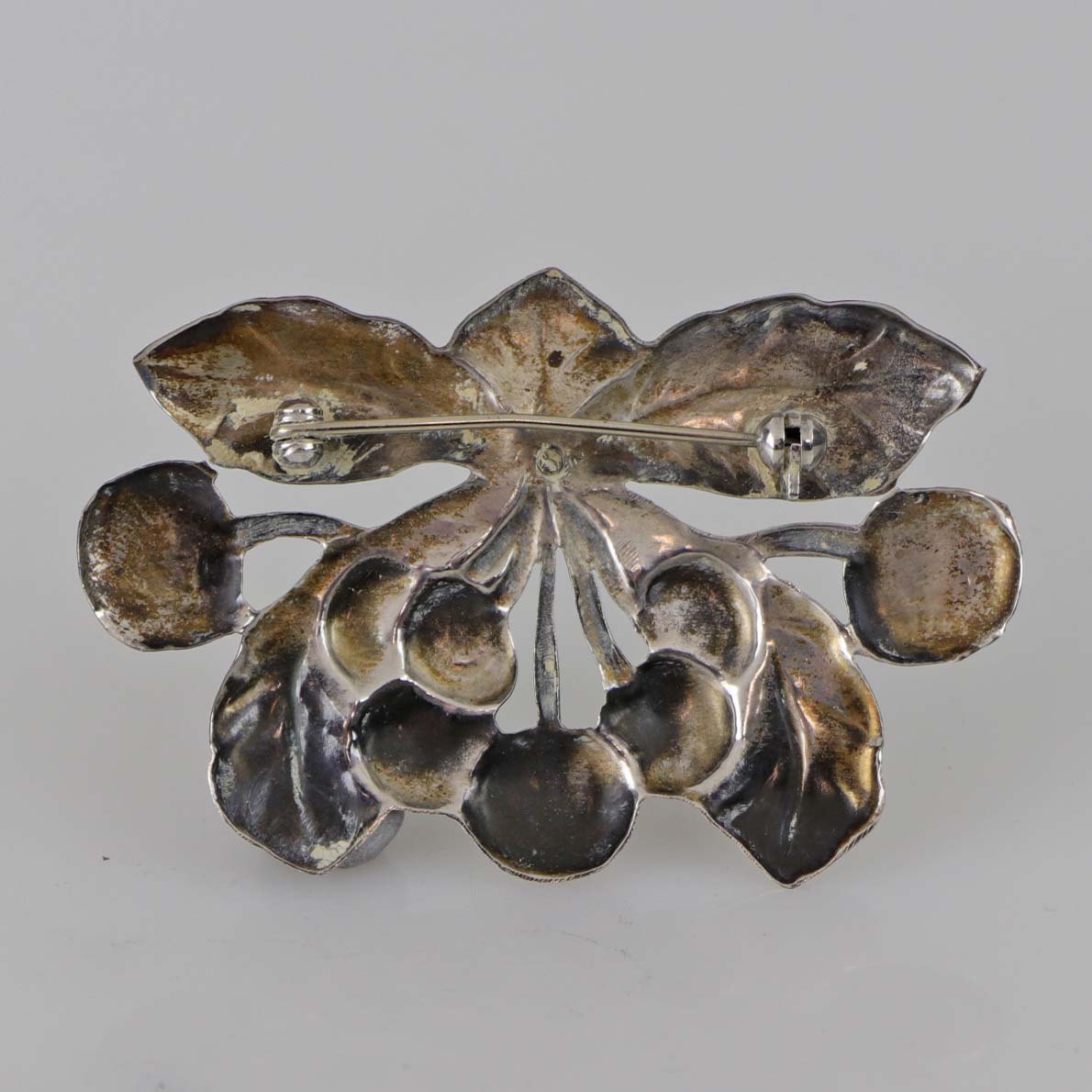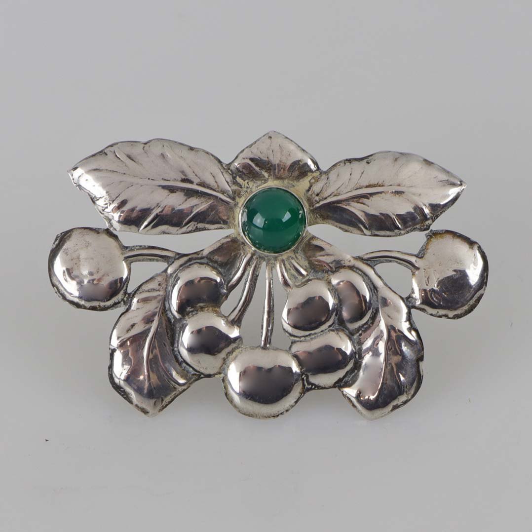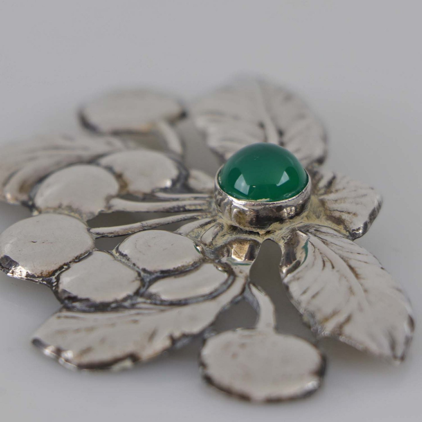 Broche i sølv udformet i skønvirke stil dekoreret med sten af grøn krysopras og motiv af blade og bær