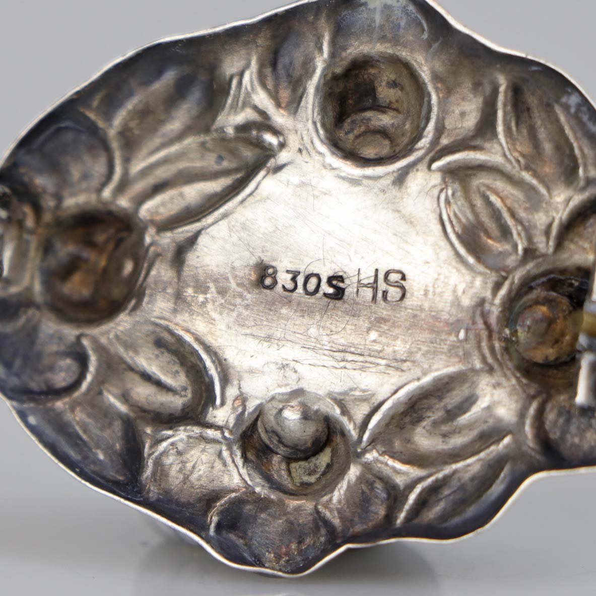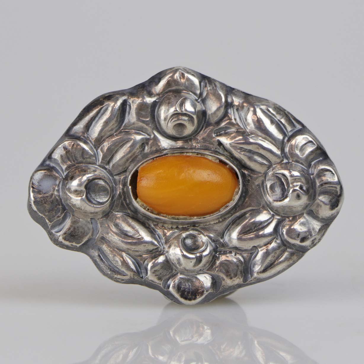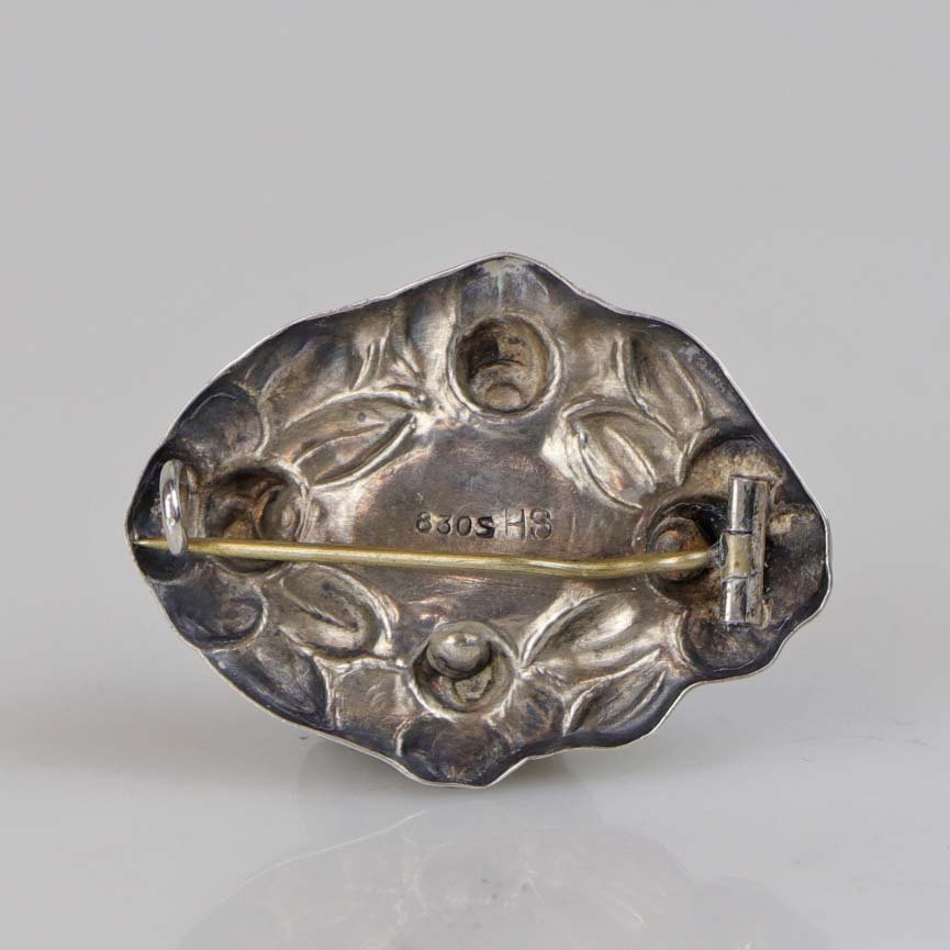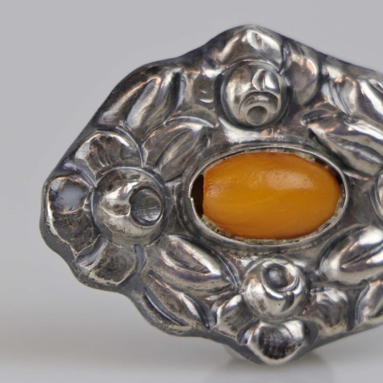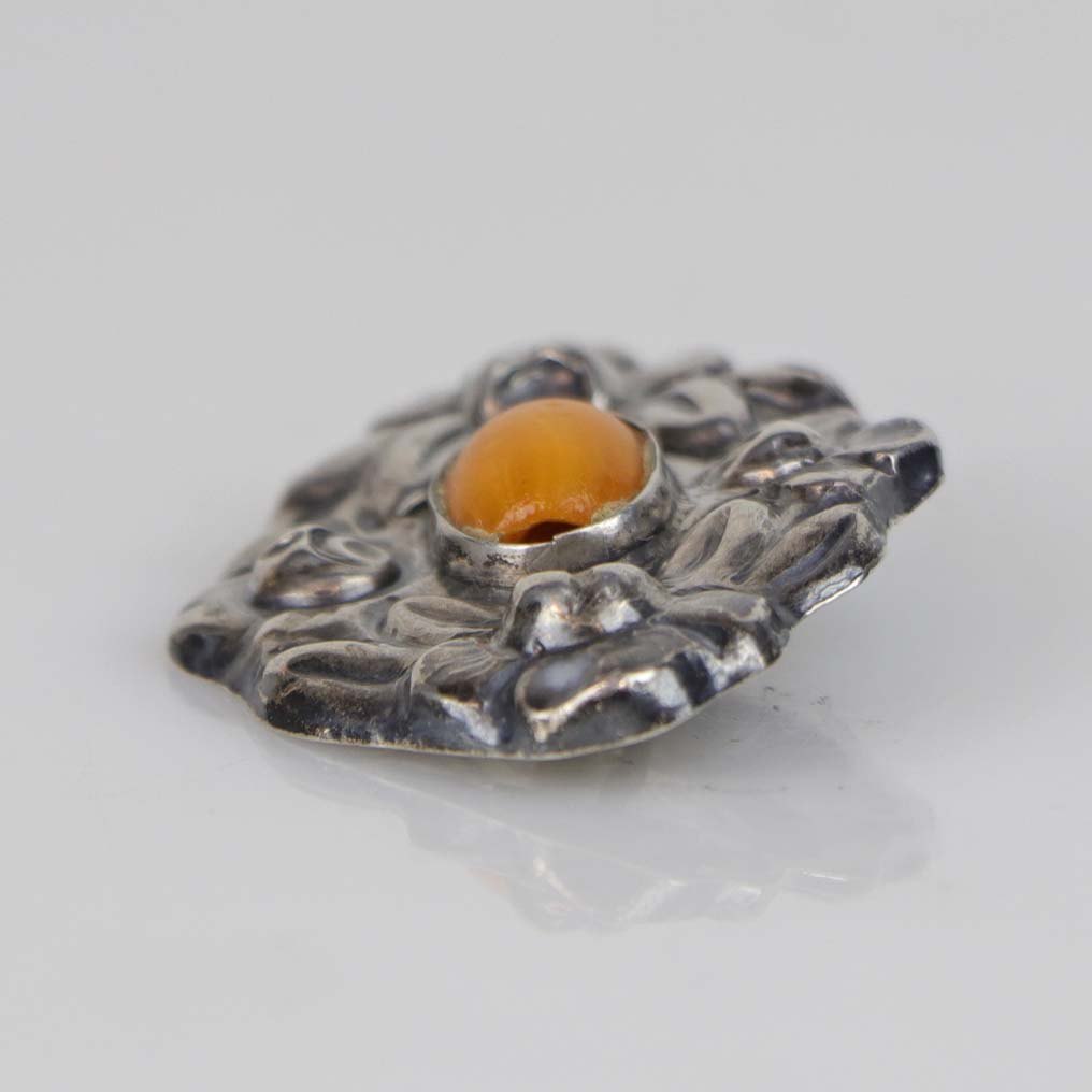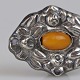 Broche i sølv udformet i skønvirke stil med rav dekoration
