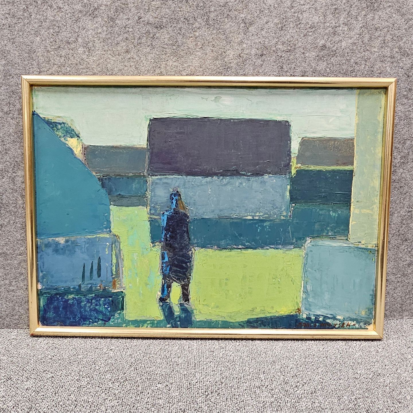 Maleri af Carlo Wognsen, med motiv af en mand der går imellem huse.
