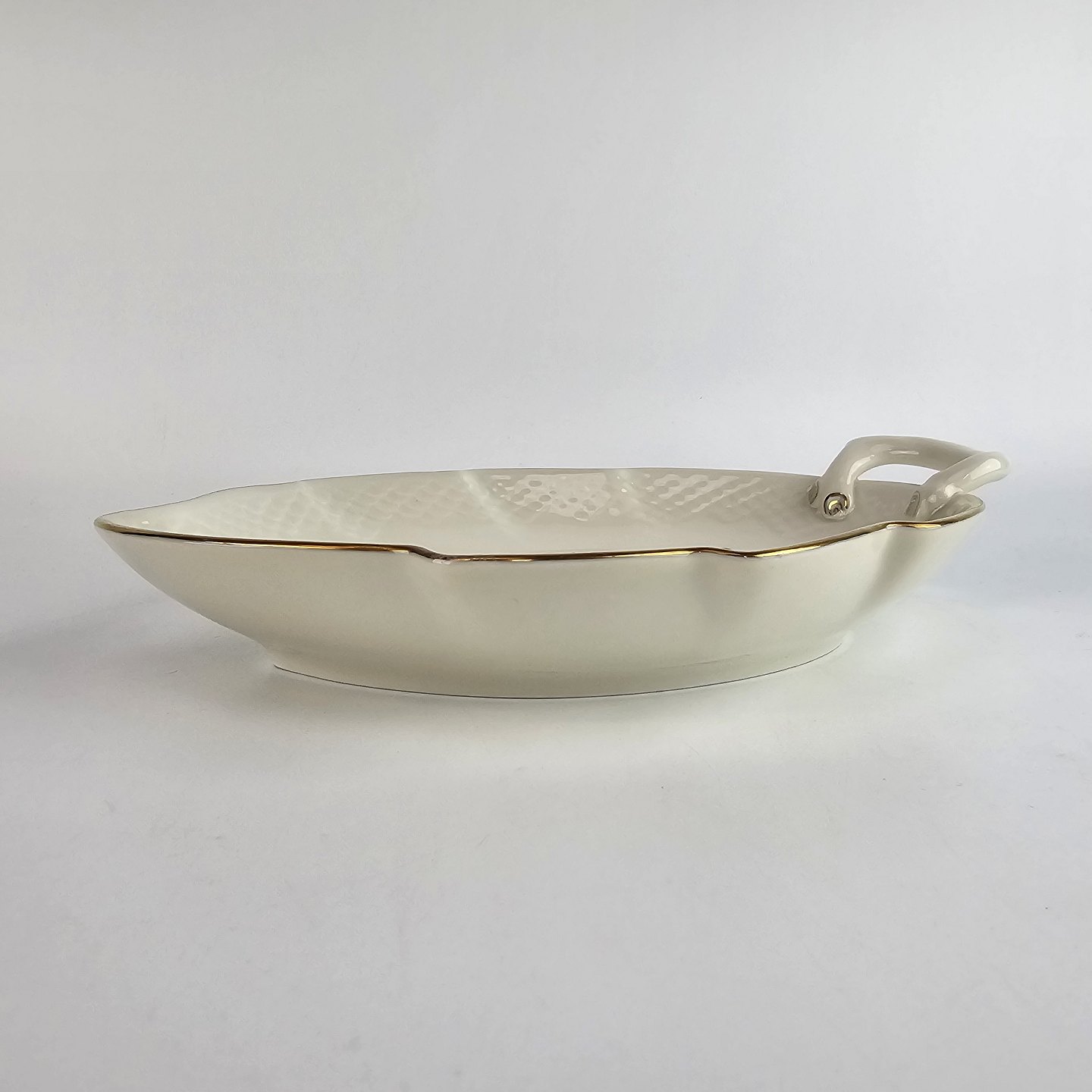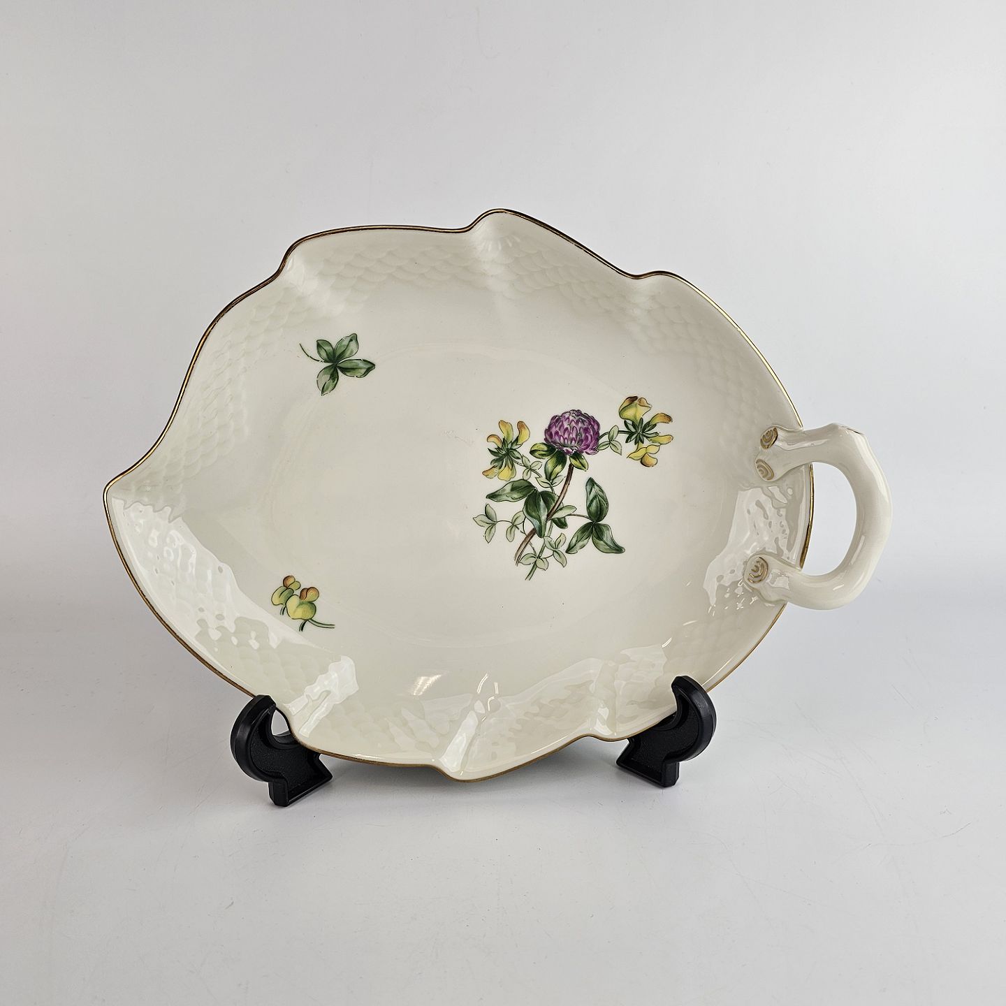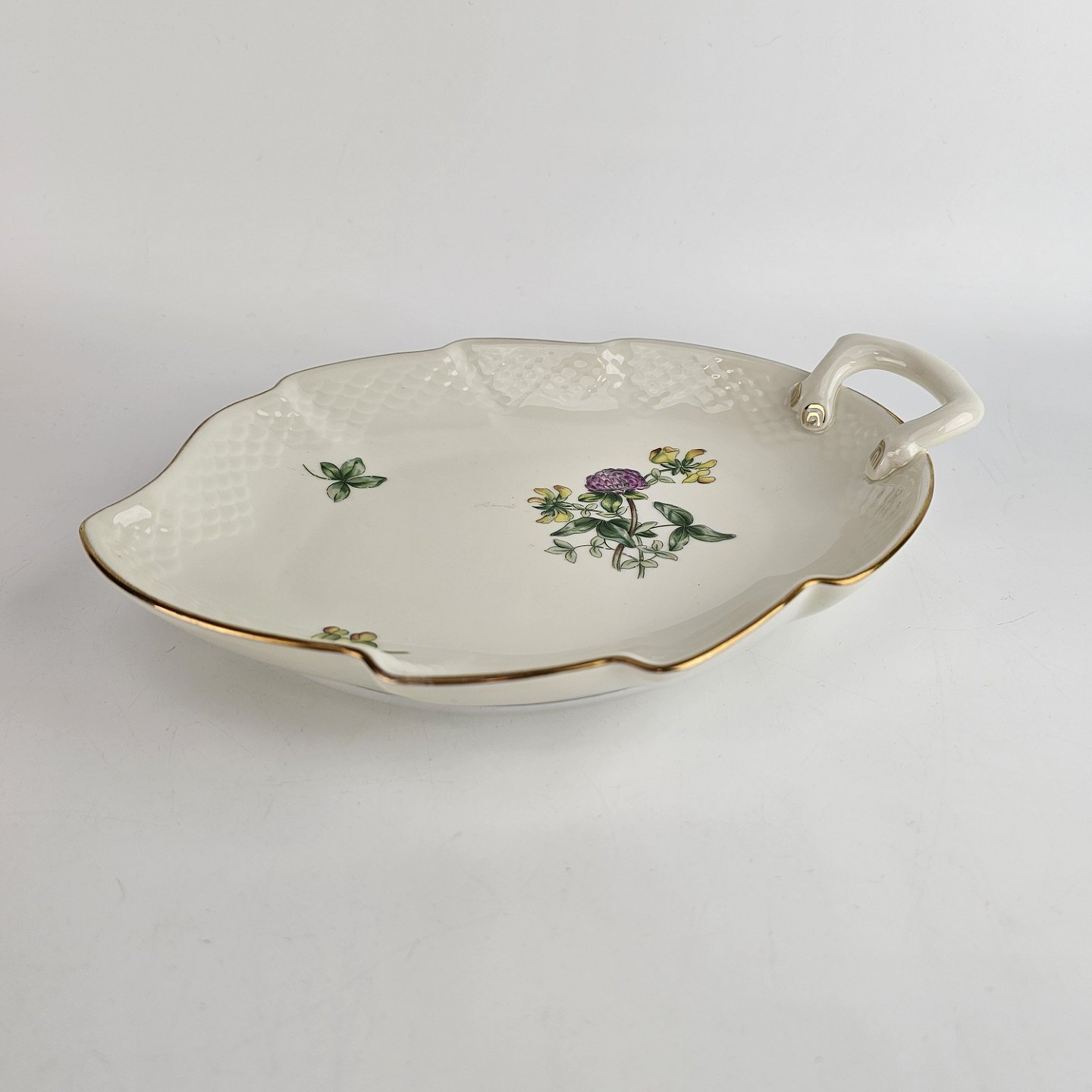 Bladformet fad af porcelæn fra stellet Hermod, også kendt som Kløverblomst. Nr 199.
