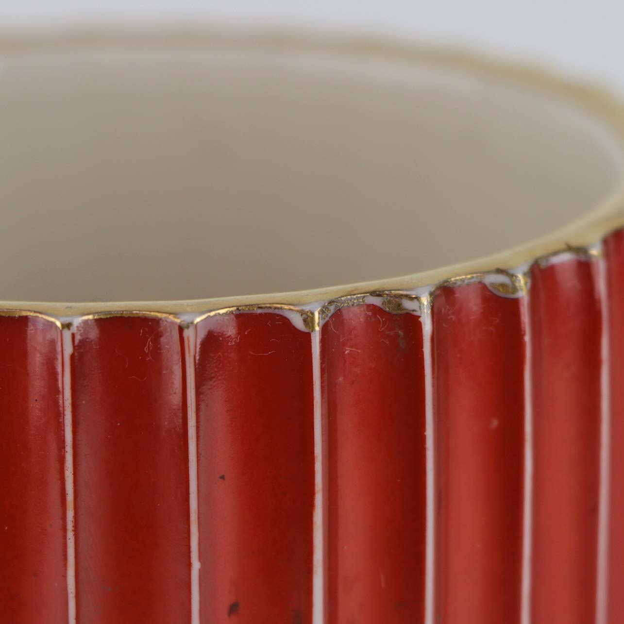 Rød cylinderformet vase i porcelæn med riller og guldkant