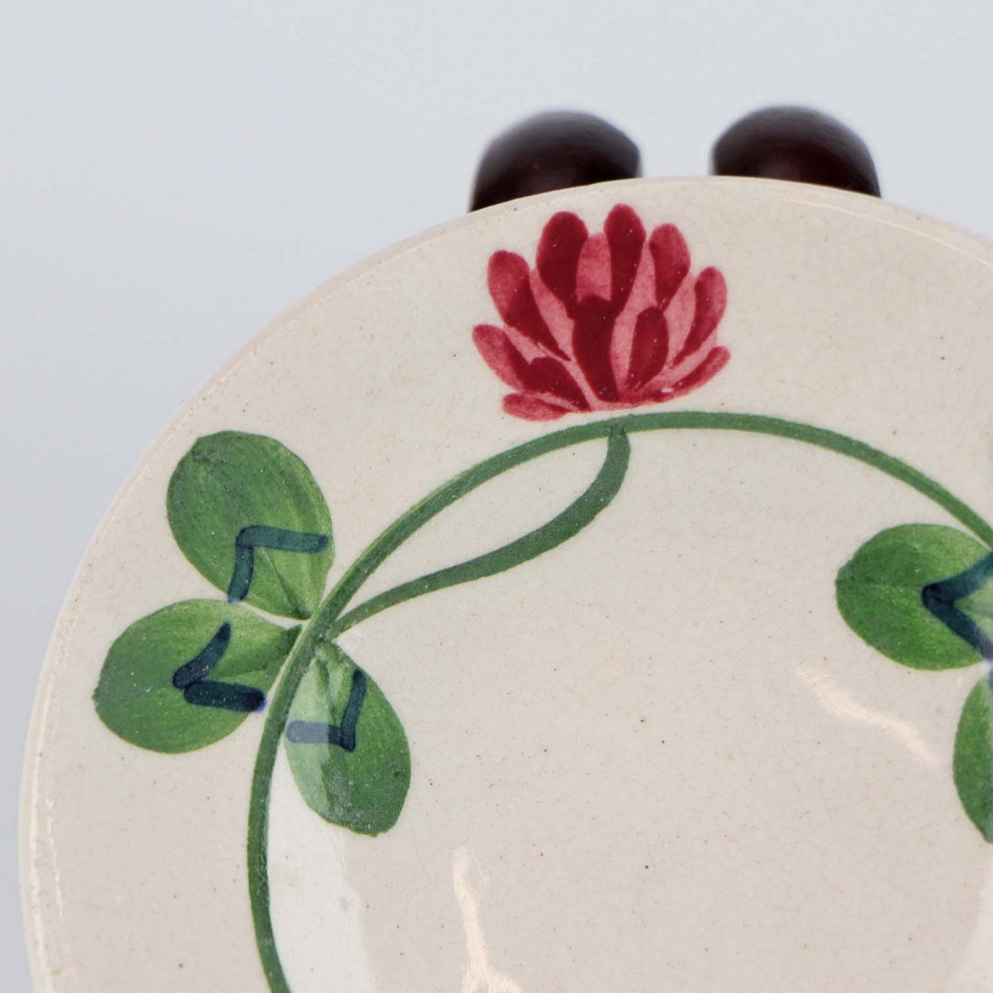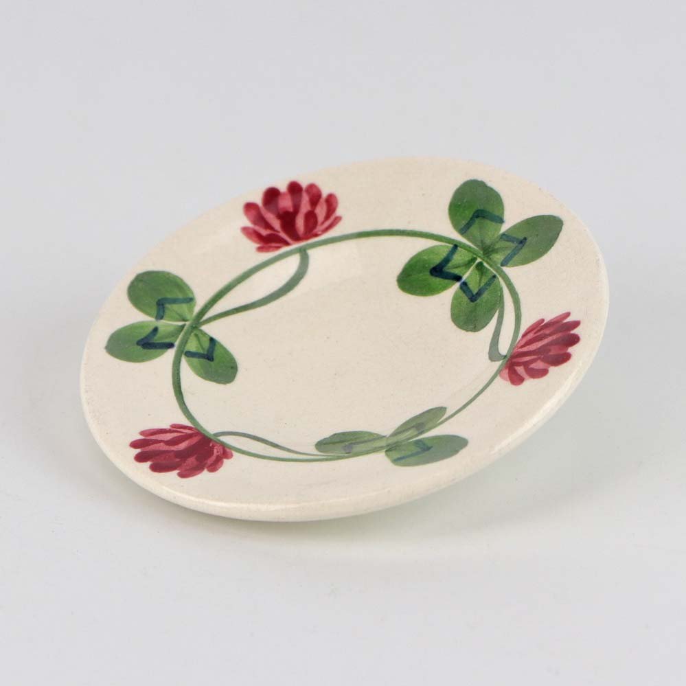 Rund asiet i kunstfajance fra stellet Kløver med motiv af rødkløver på lys baggrund. Nr. 181/301