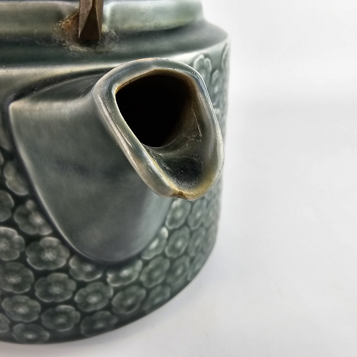 Stel i blågrøn stentøj med blomster motiver og håndtag i messing beklædt med bambusflet.