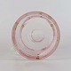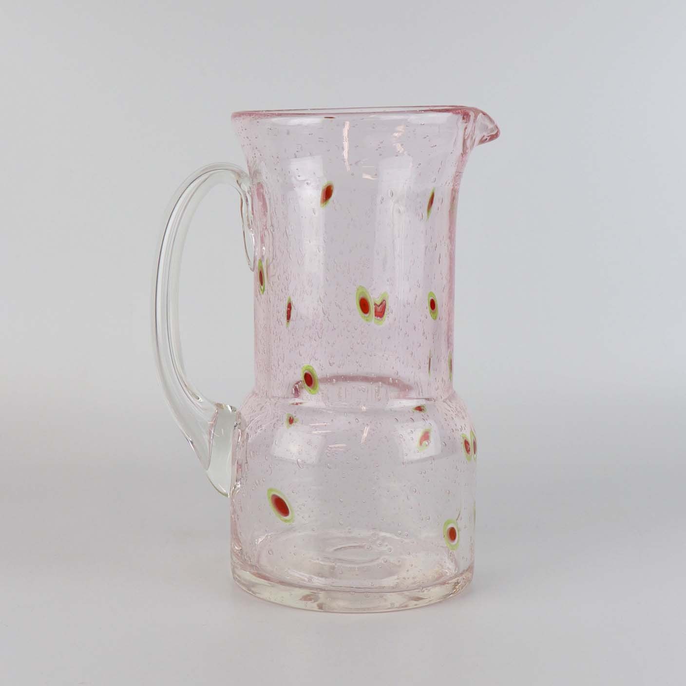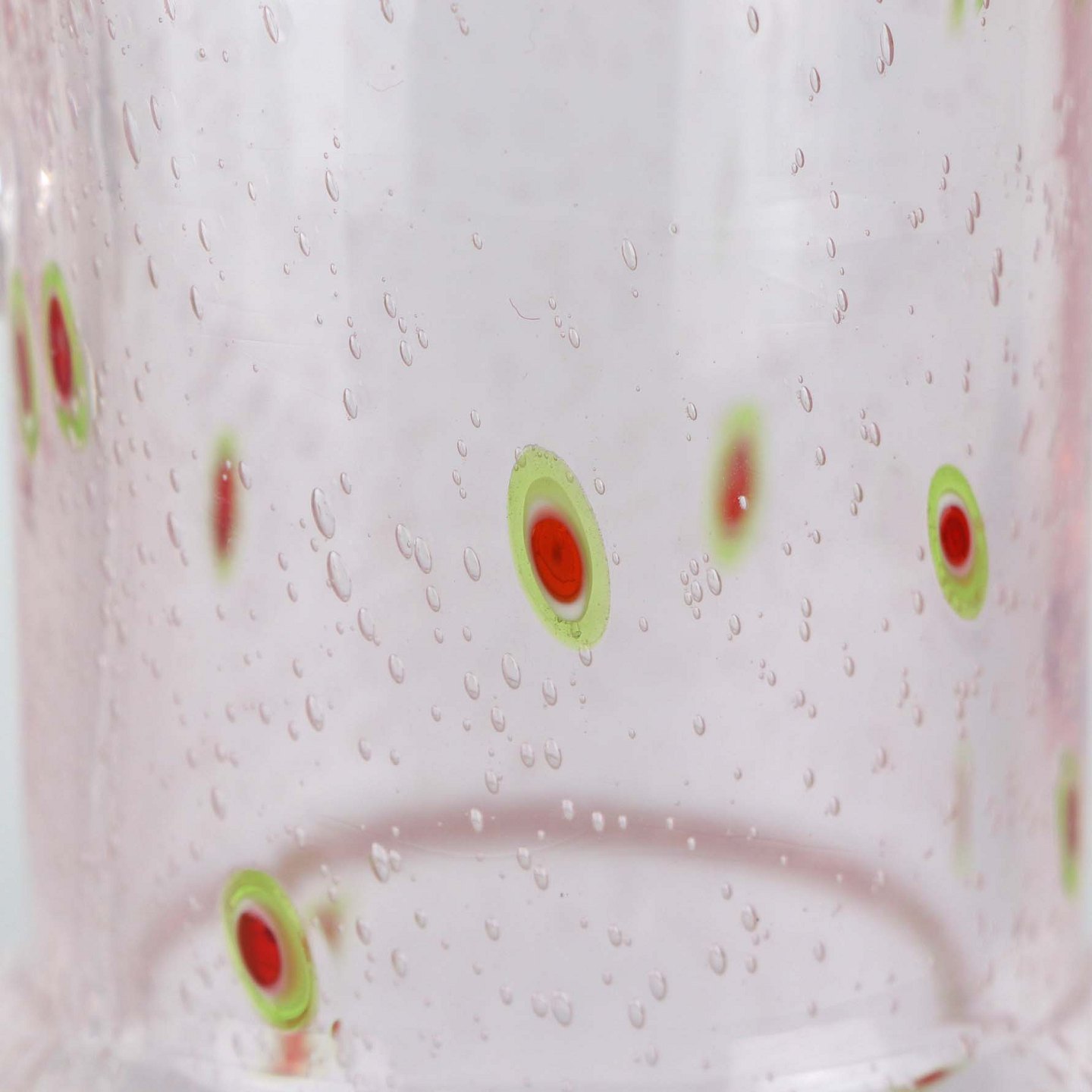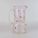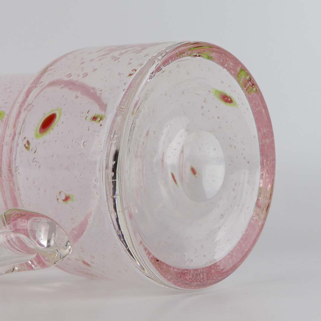 Vandkande i klart lyserødt glas med boblemønster samt grønne og røde ovale motiver
