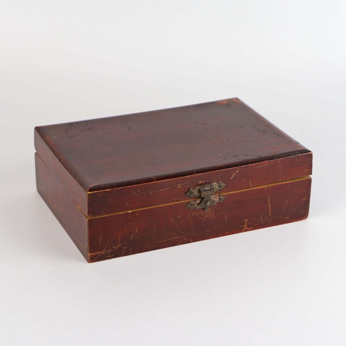 Ældre sæt røde og hvide skak brikker af ben med bund af grøn filt i ældre træboks. i alt 32 brikker.