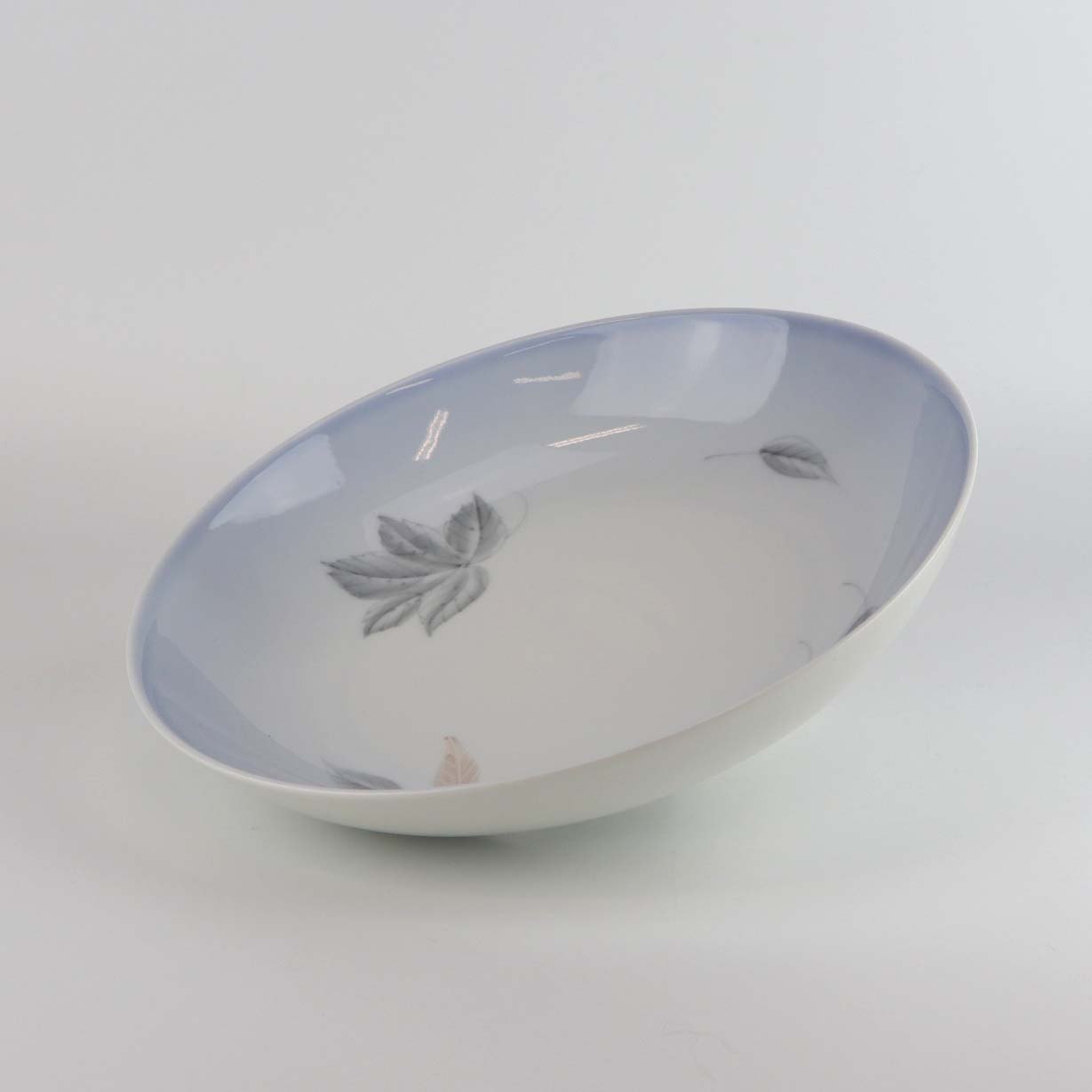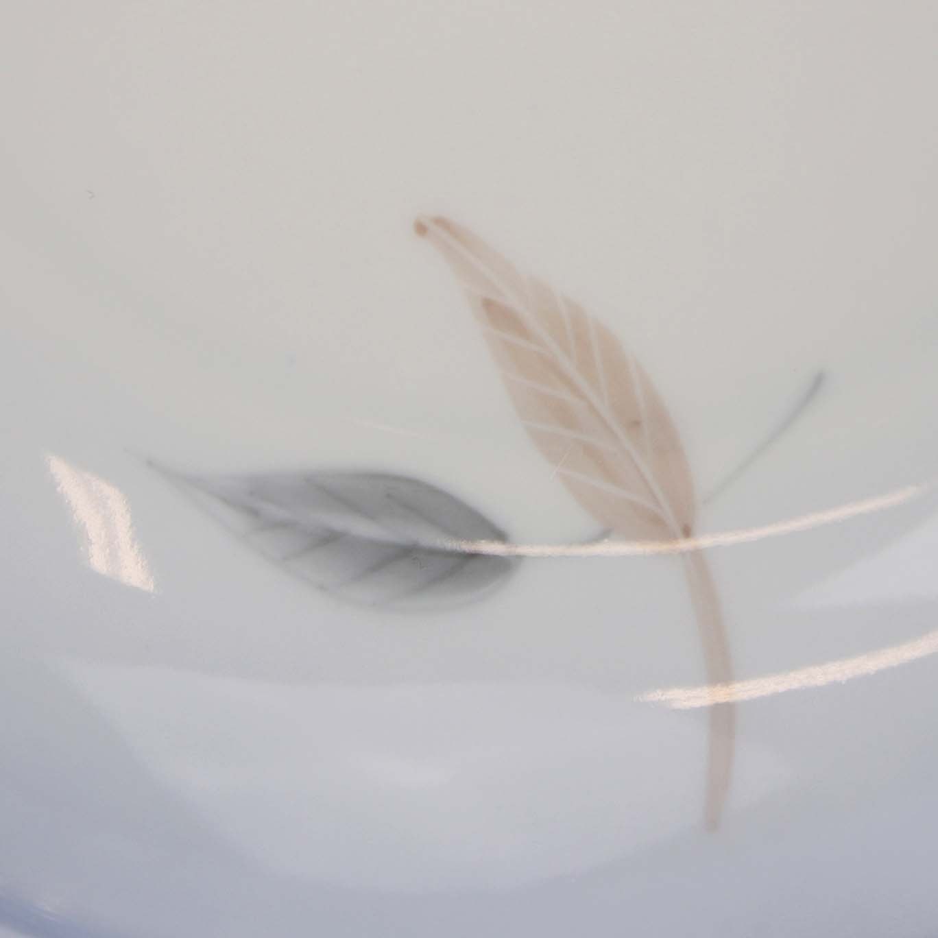 Løvfald er hvidt porcelæn som toner ud i blå, dekoreret med faldende blade i sort og rødt.