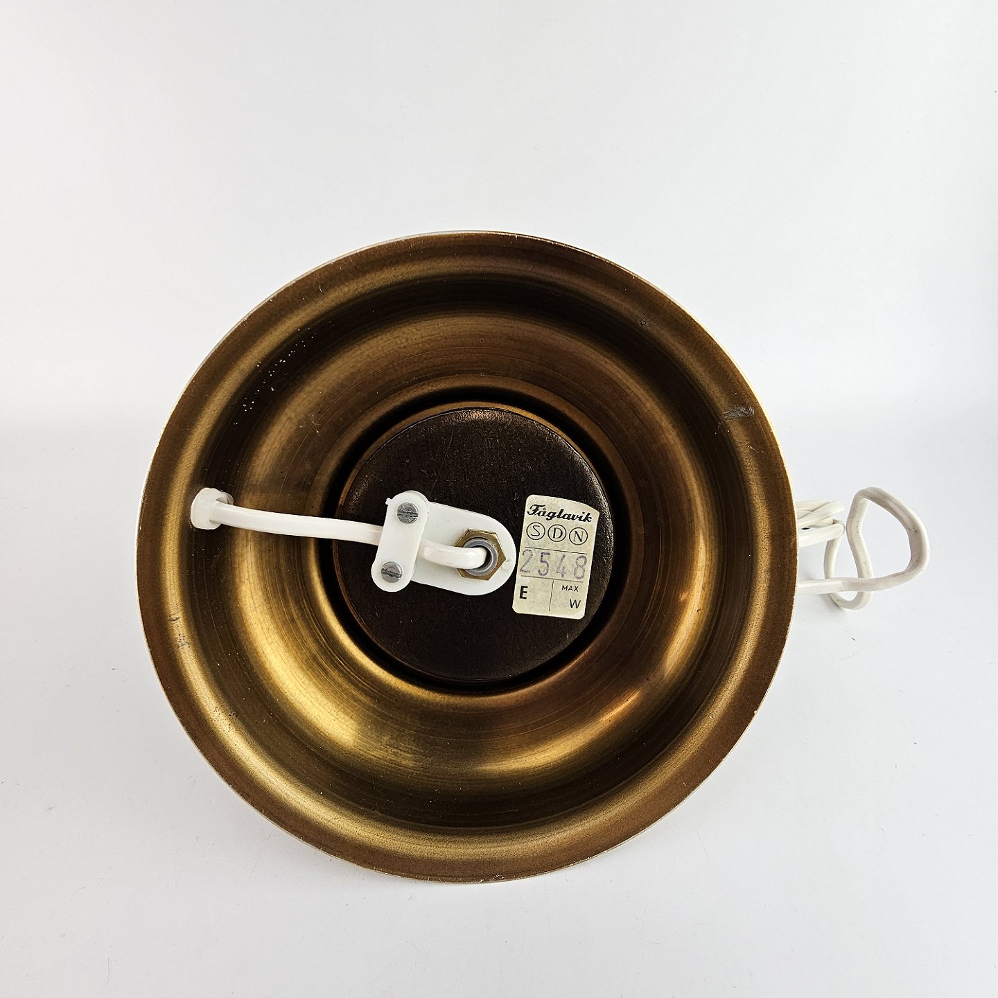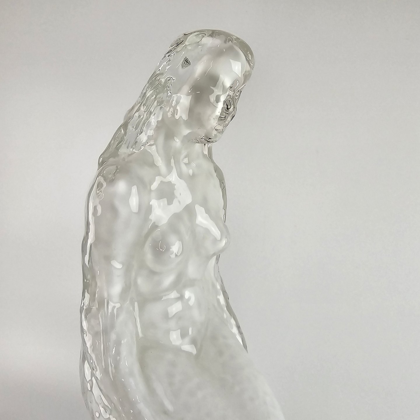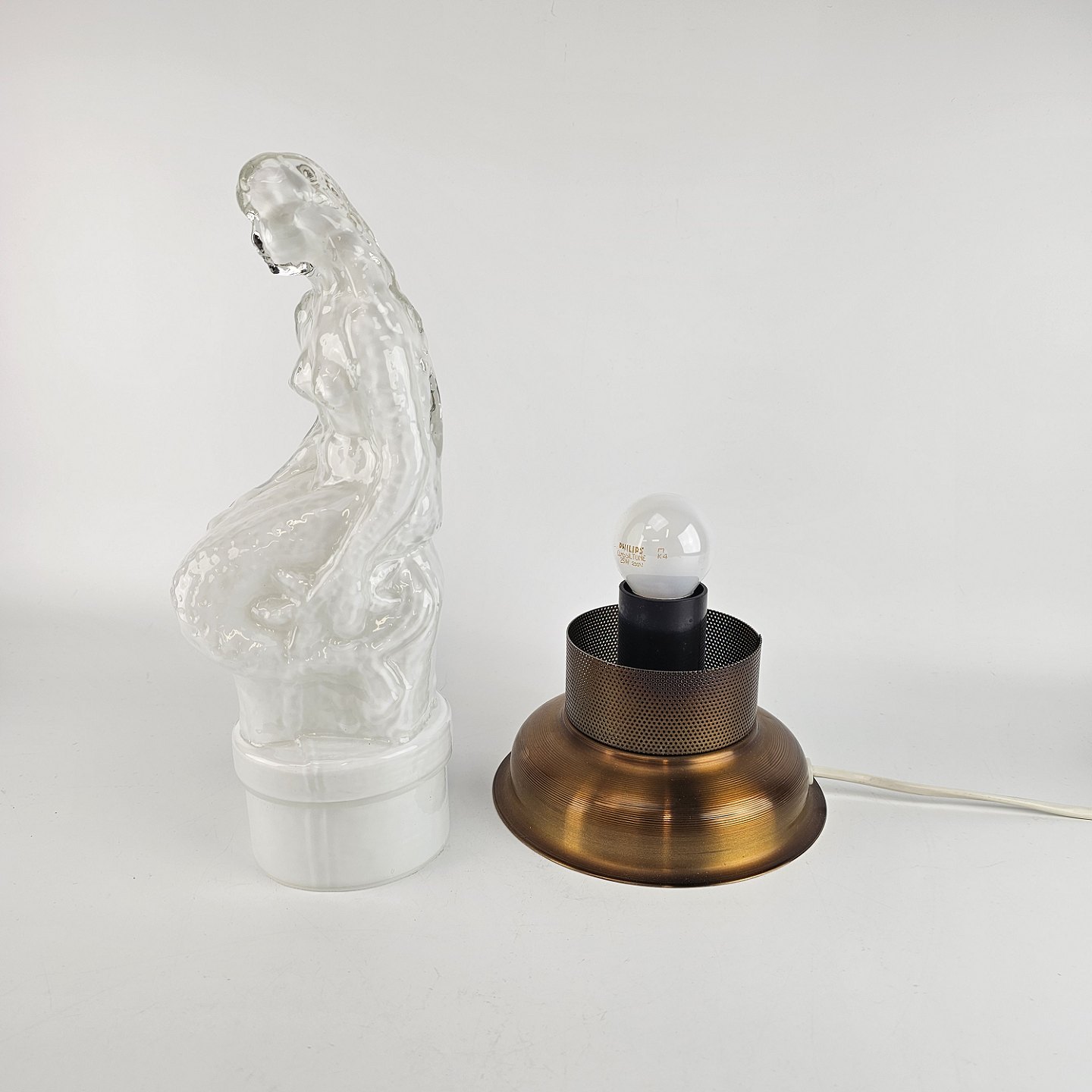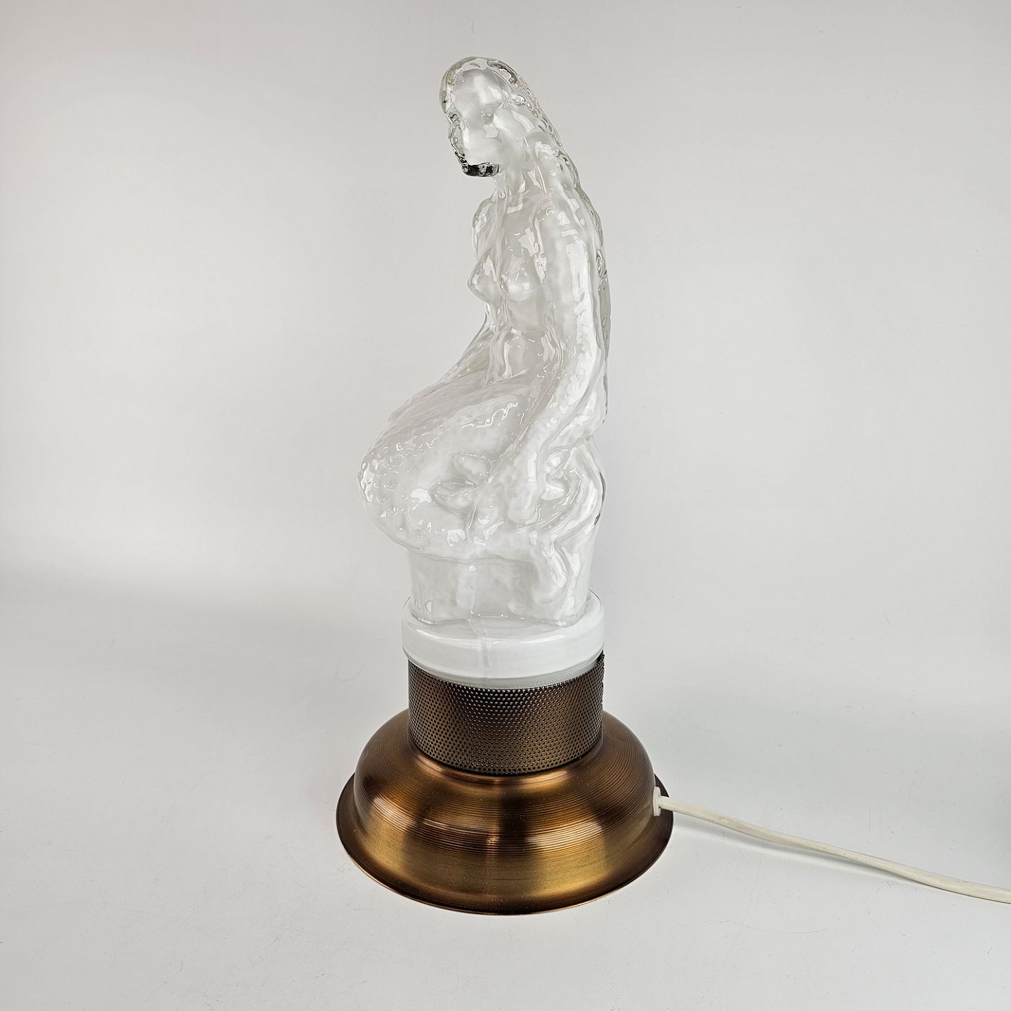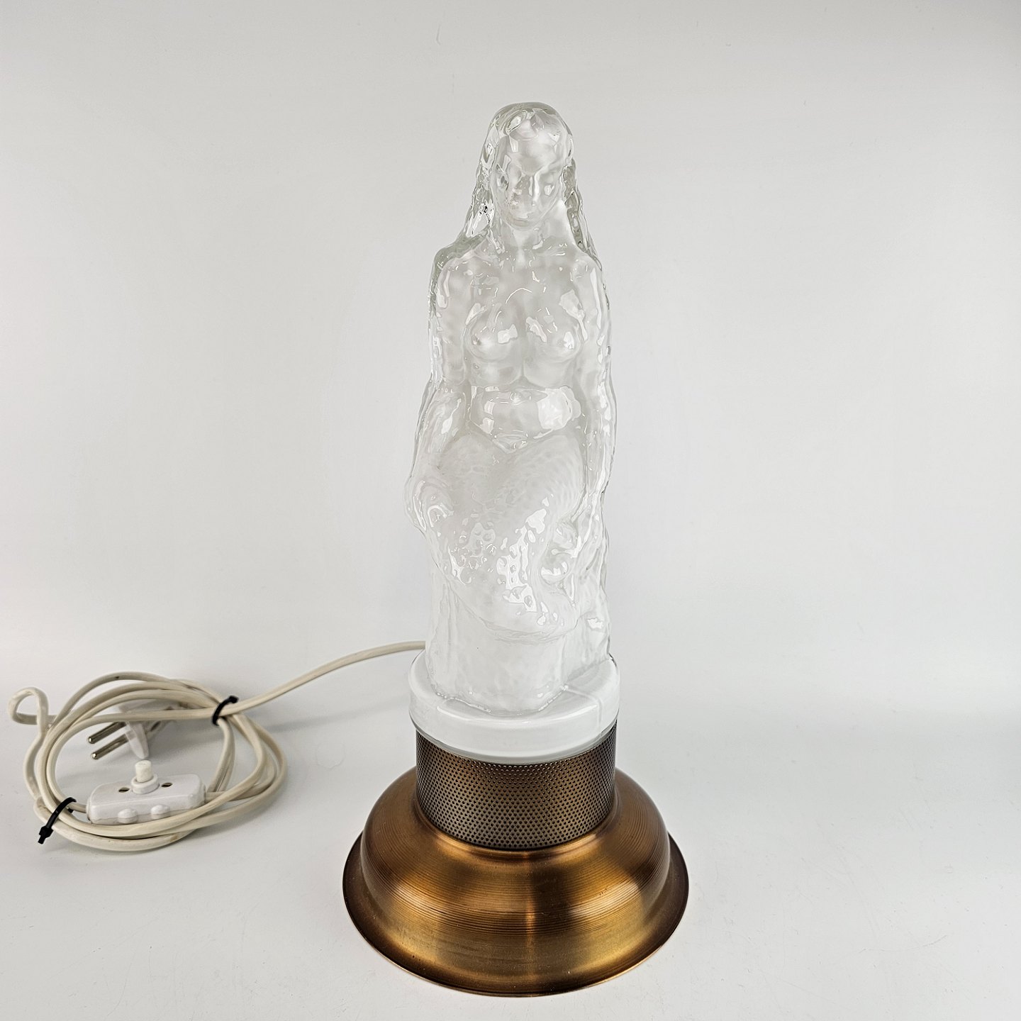Lampe af hvidt opalglas med klart overfangsglas, med motiv af en havfrue siddende på en sten. Kaldt Sjöjungfru (havfrue).