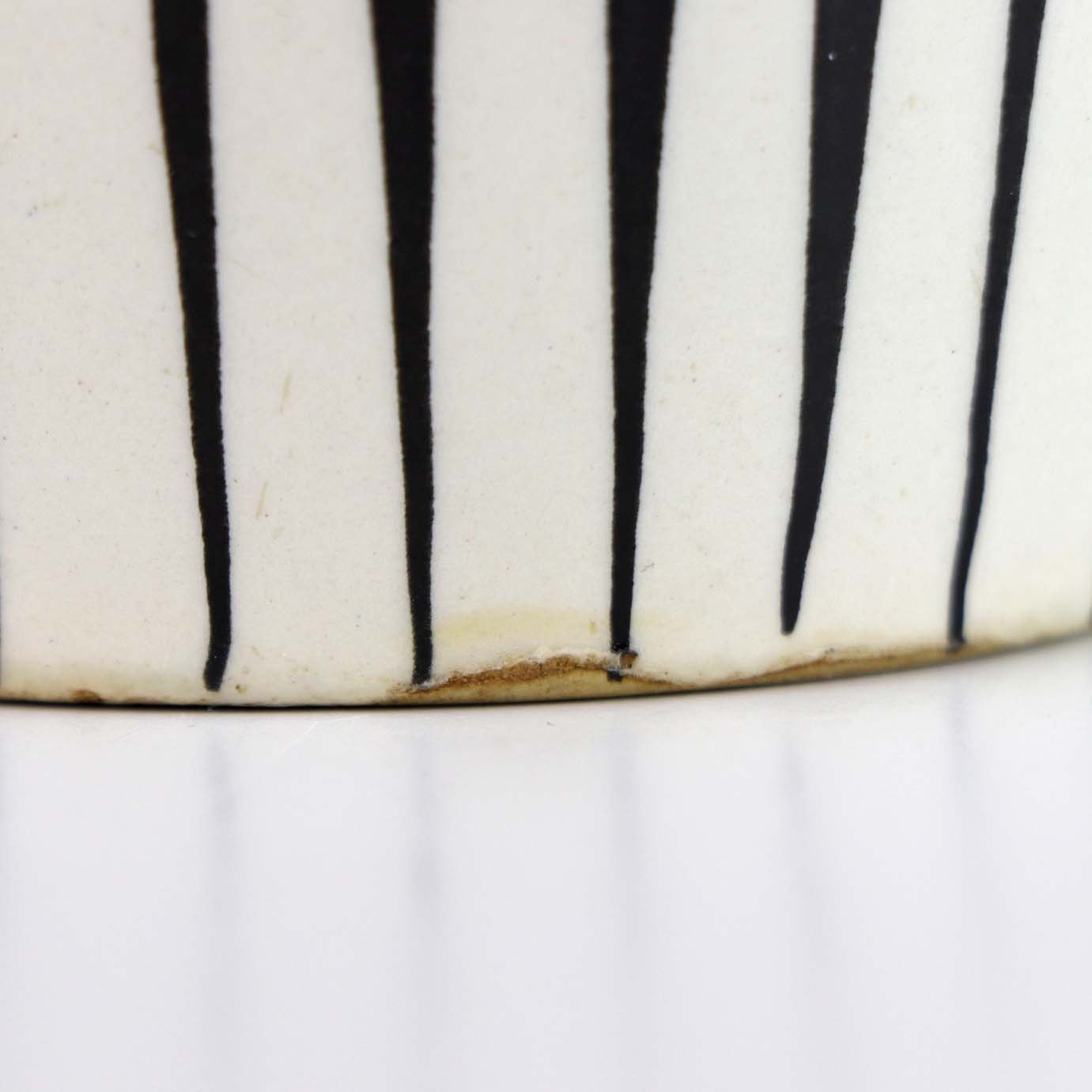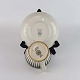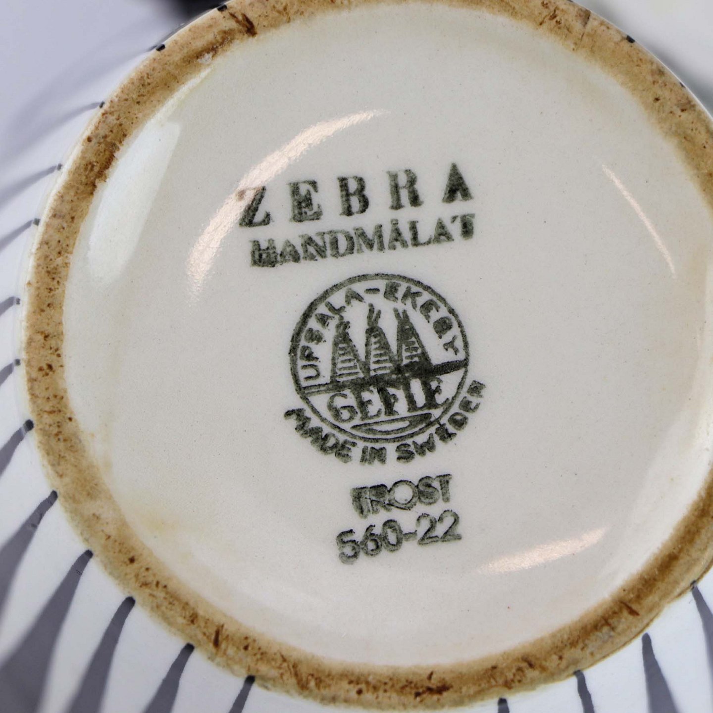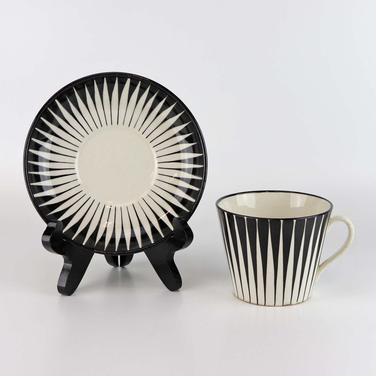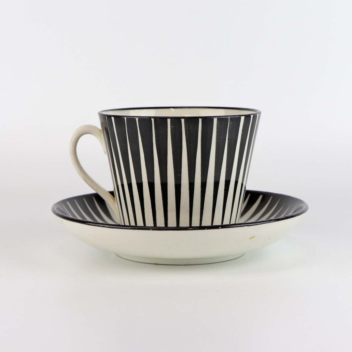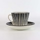Håndmalet tekop eller chokoladekop med underkop i fajance fra stellet Zebra med mønster i sorte og hvide striber. Nr. 560/32 og 560/22