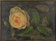 Antikt oliemaleri på plade i træramme fra 1848 med naturalistisk motiv af lyserød rose med blade på mørk baggrund