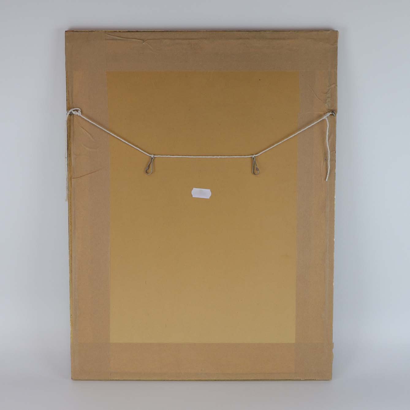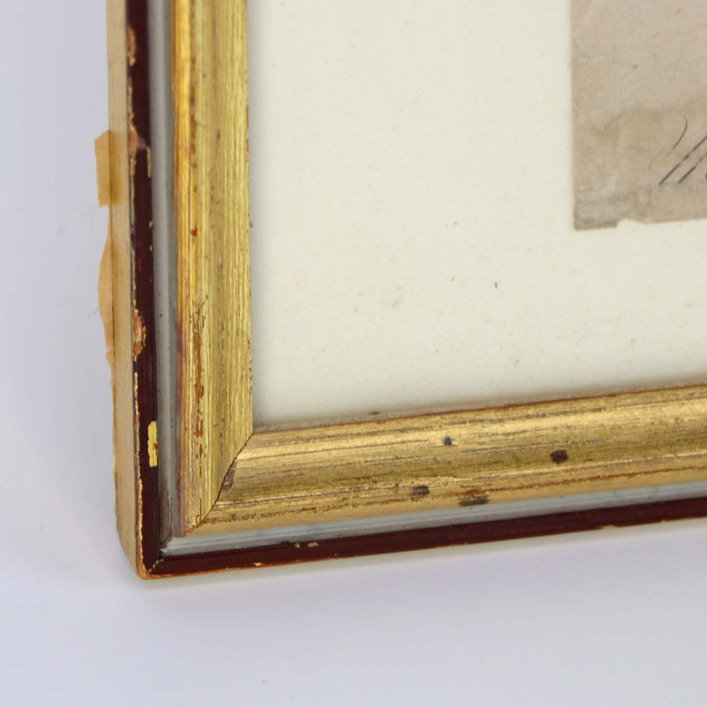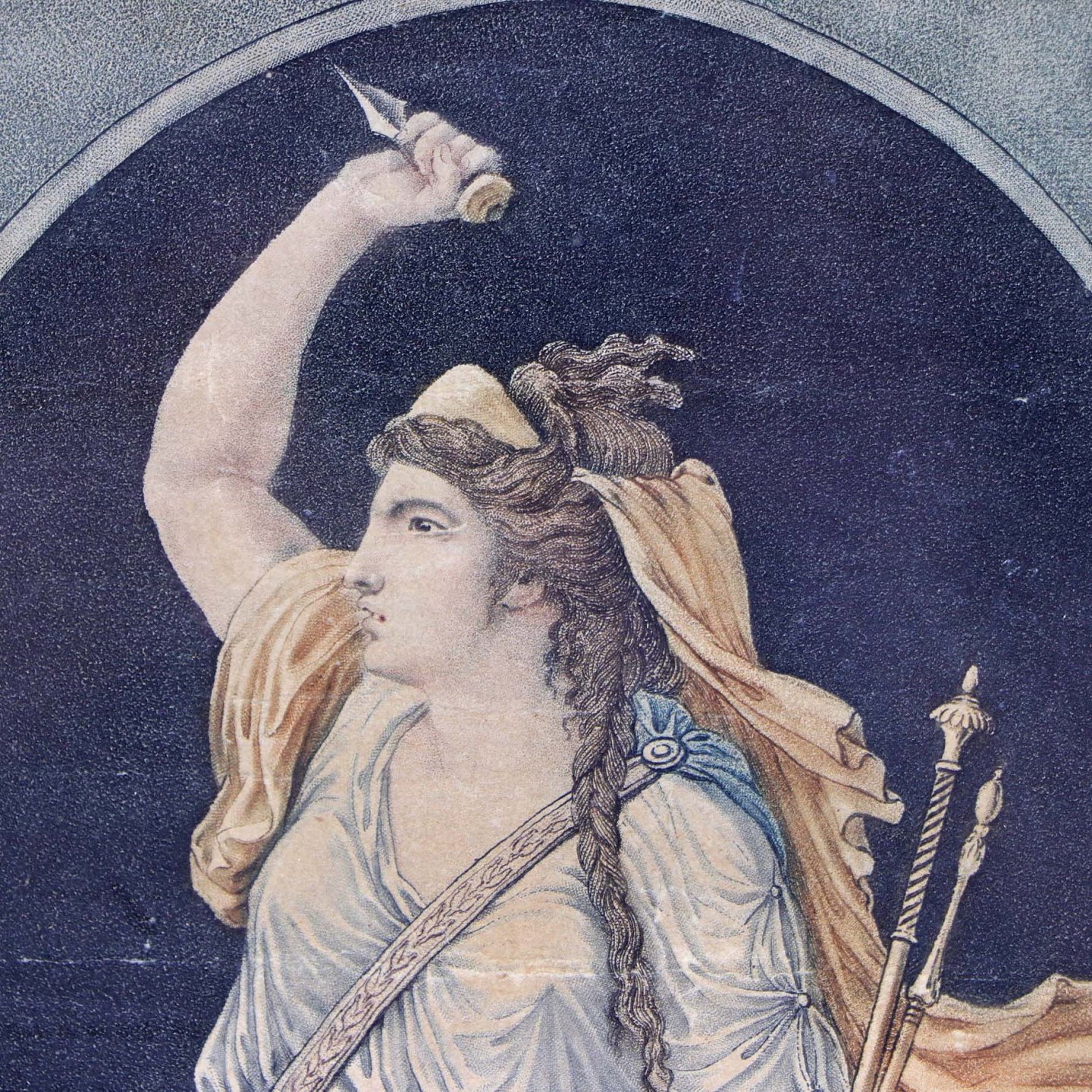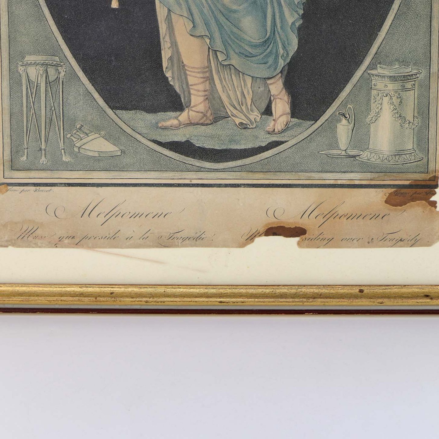 Indrammet bogtryk i malet træramme med motiv af den græske gudinde Melpomene, som står med hævet dolk i hånden.