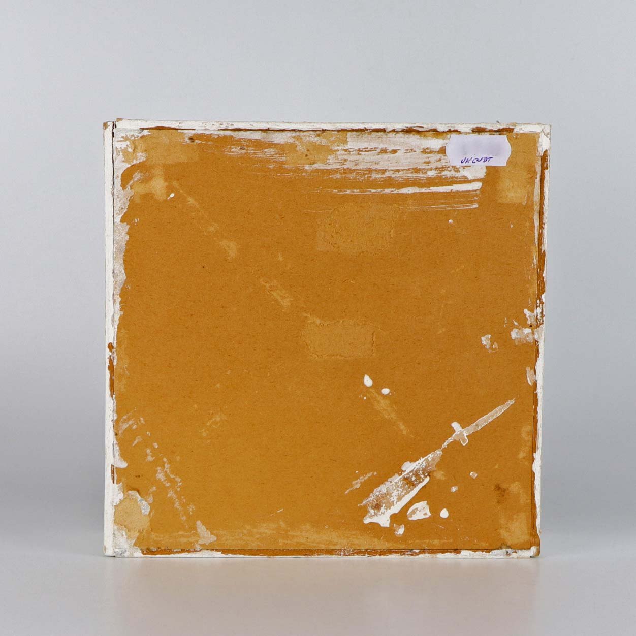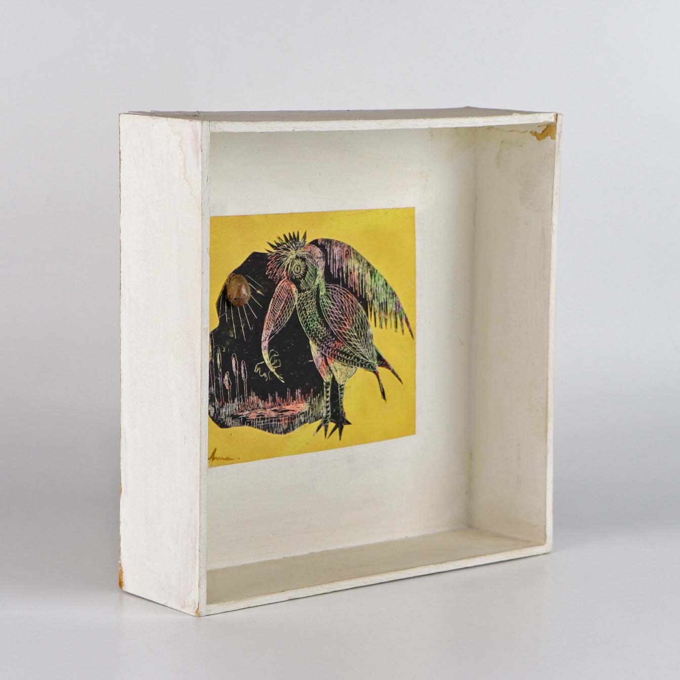 Multifarvet radering på sort baggrund i hvidmalet træramme med motiv af fugl ved sø. Den udklippede radering er monteret på gul baggrund med påsat sten i venstre hjørne.