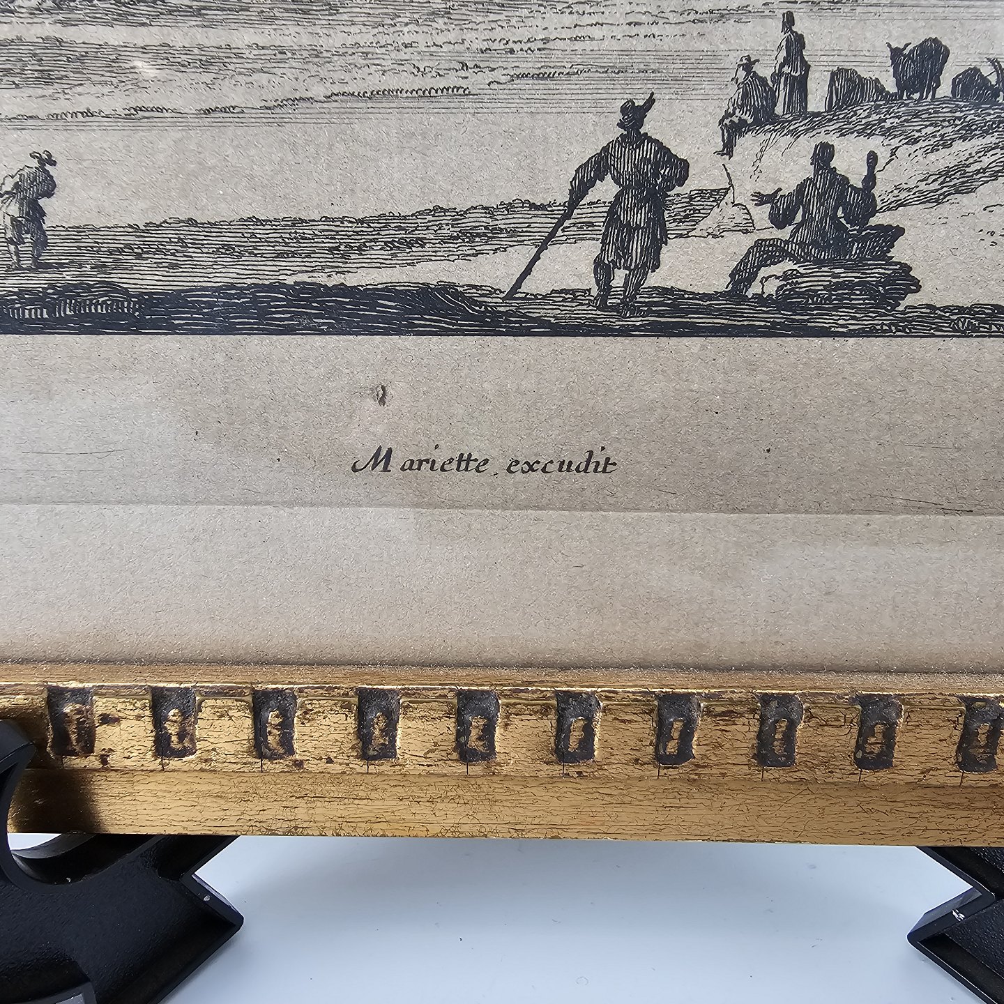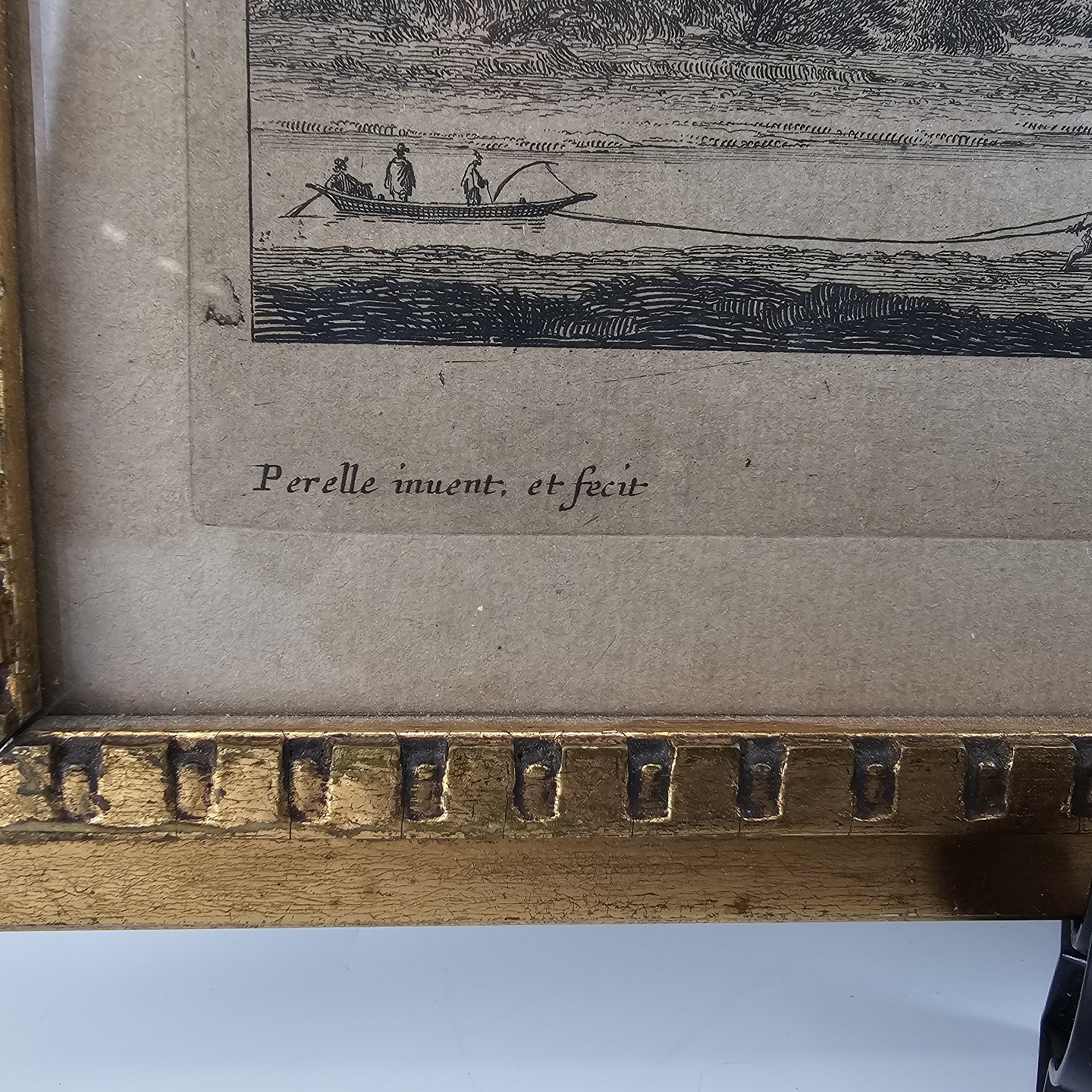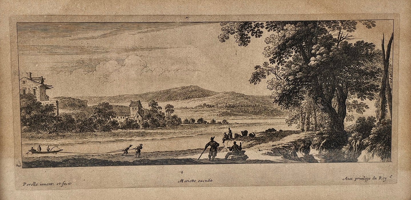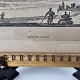 Bogtryk med motiv af landskab med en flod med både på og mennesker der går i forgrunden.