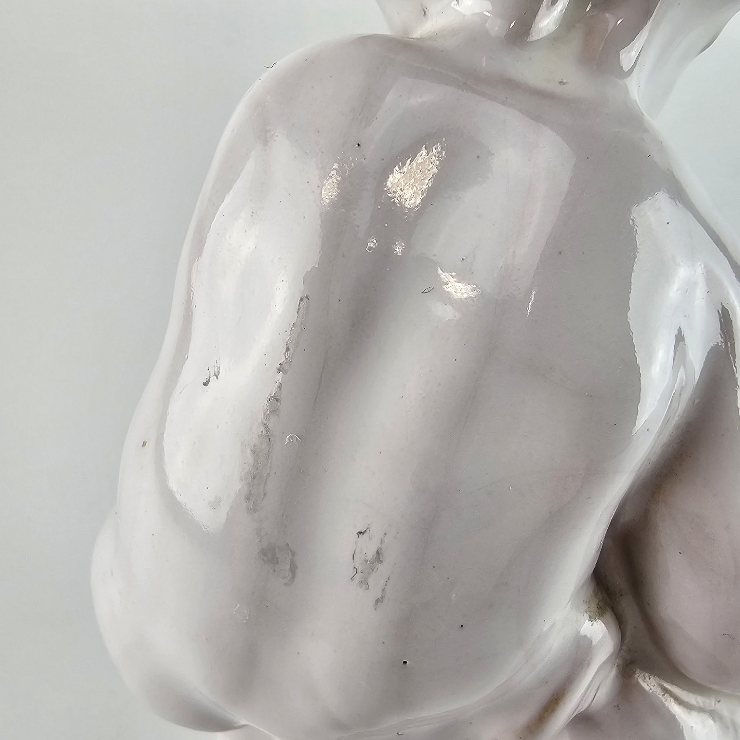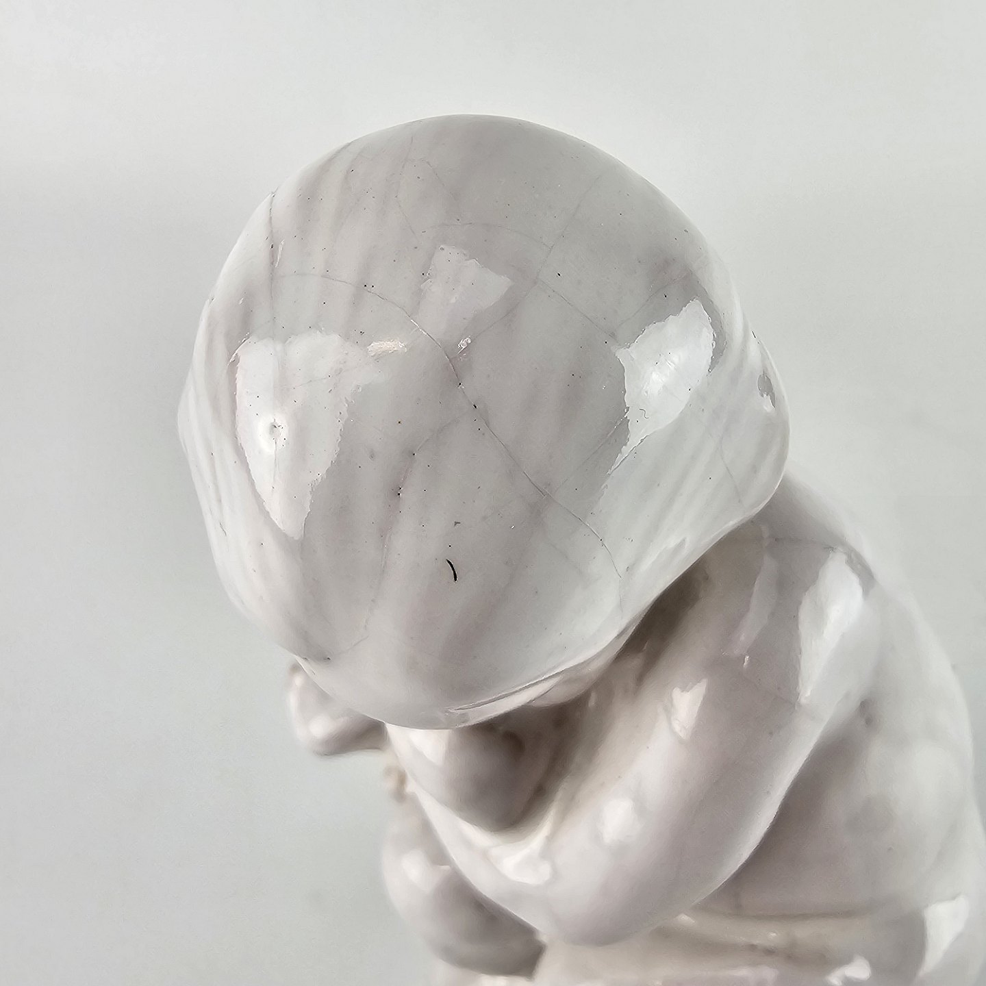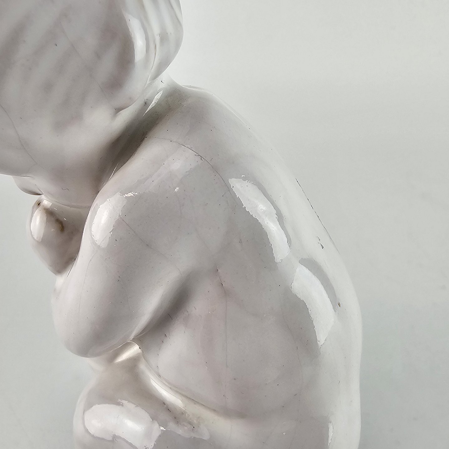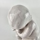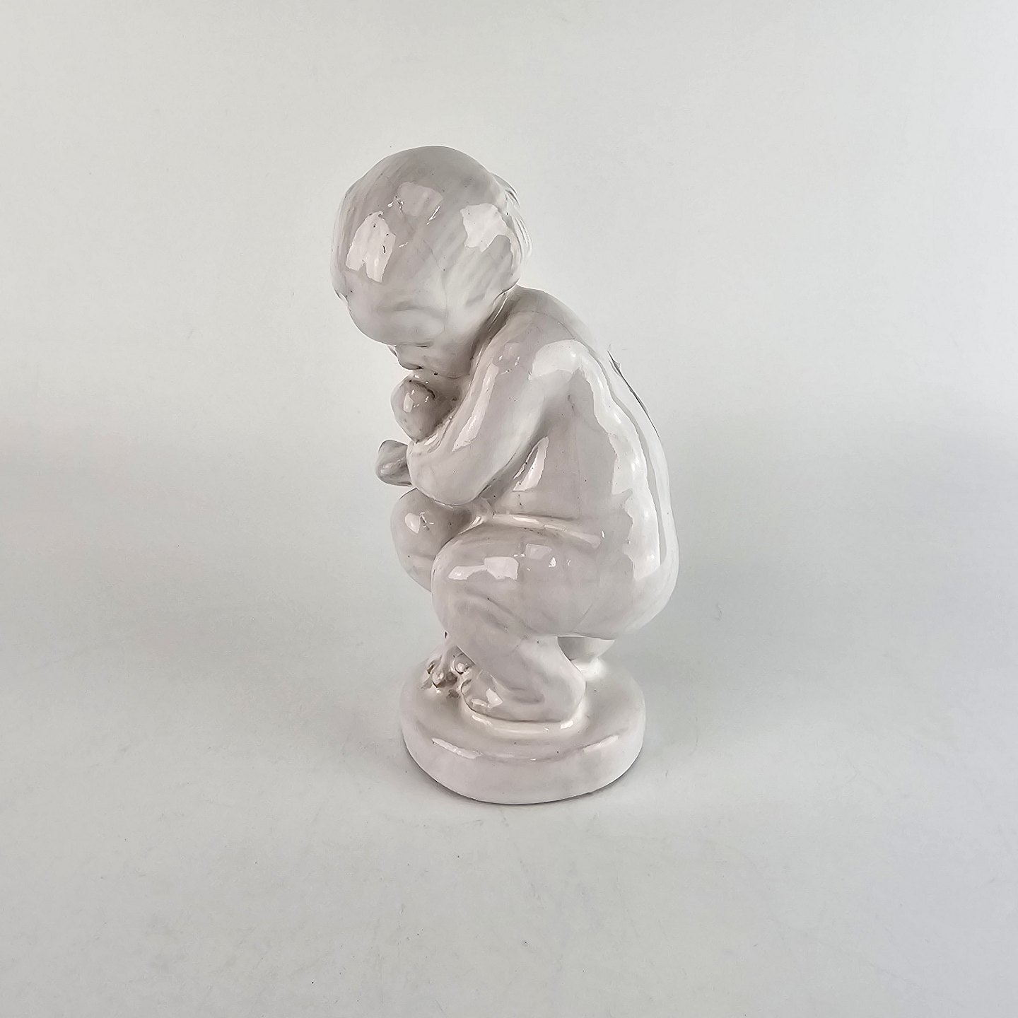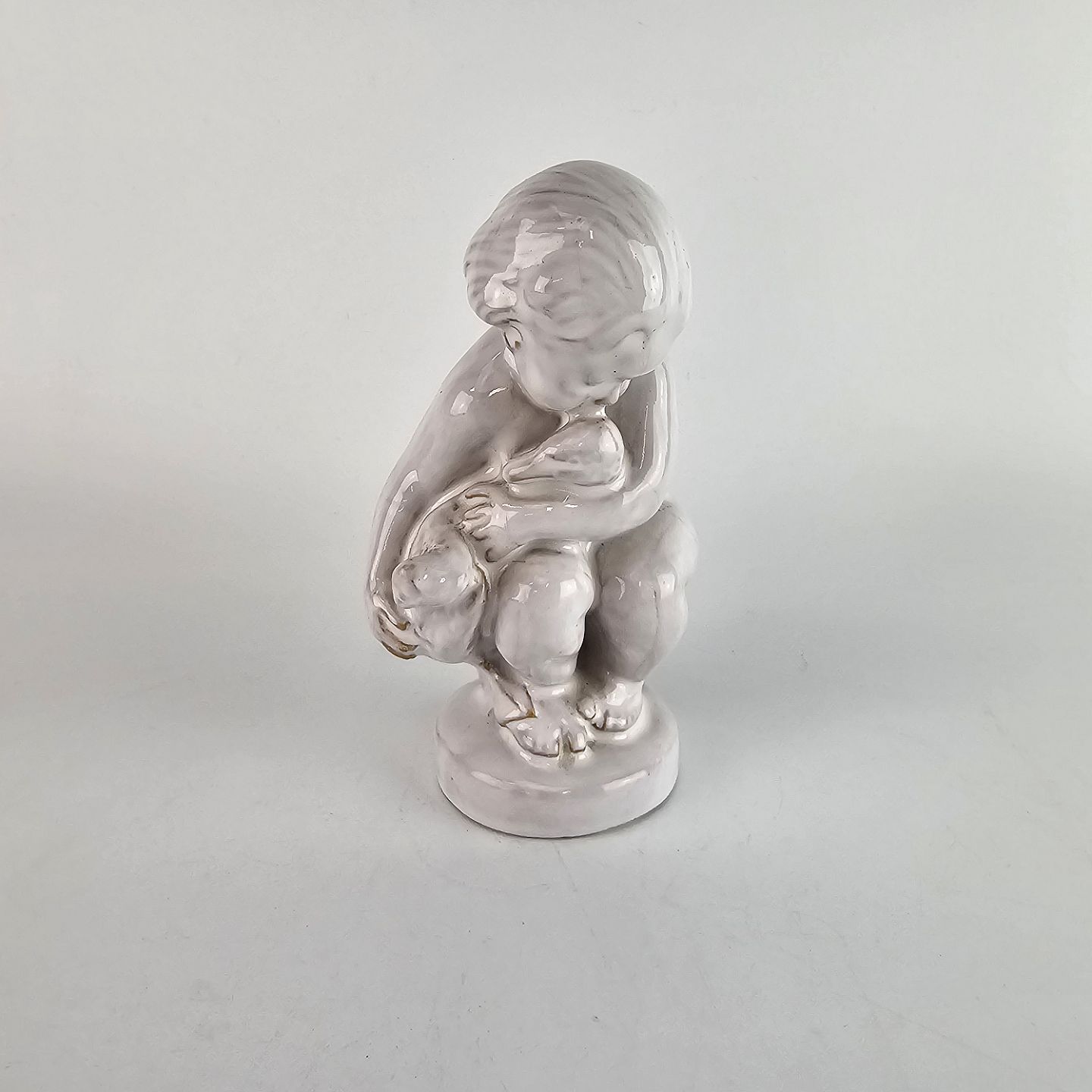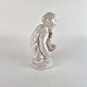 Figur af hvidglaseret keramik med motiv af et barn som holder en svane.