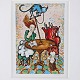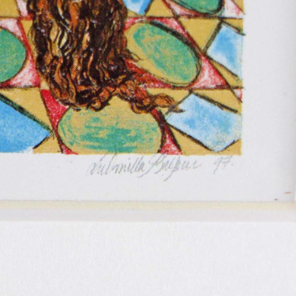 Indrammet tryk med hvidt passepartout i sølvmalet træramme med eventyrligt motiv af to kvinder og en kat. Dateret til 1997.