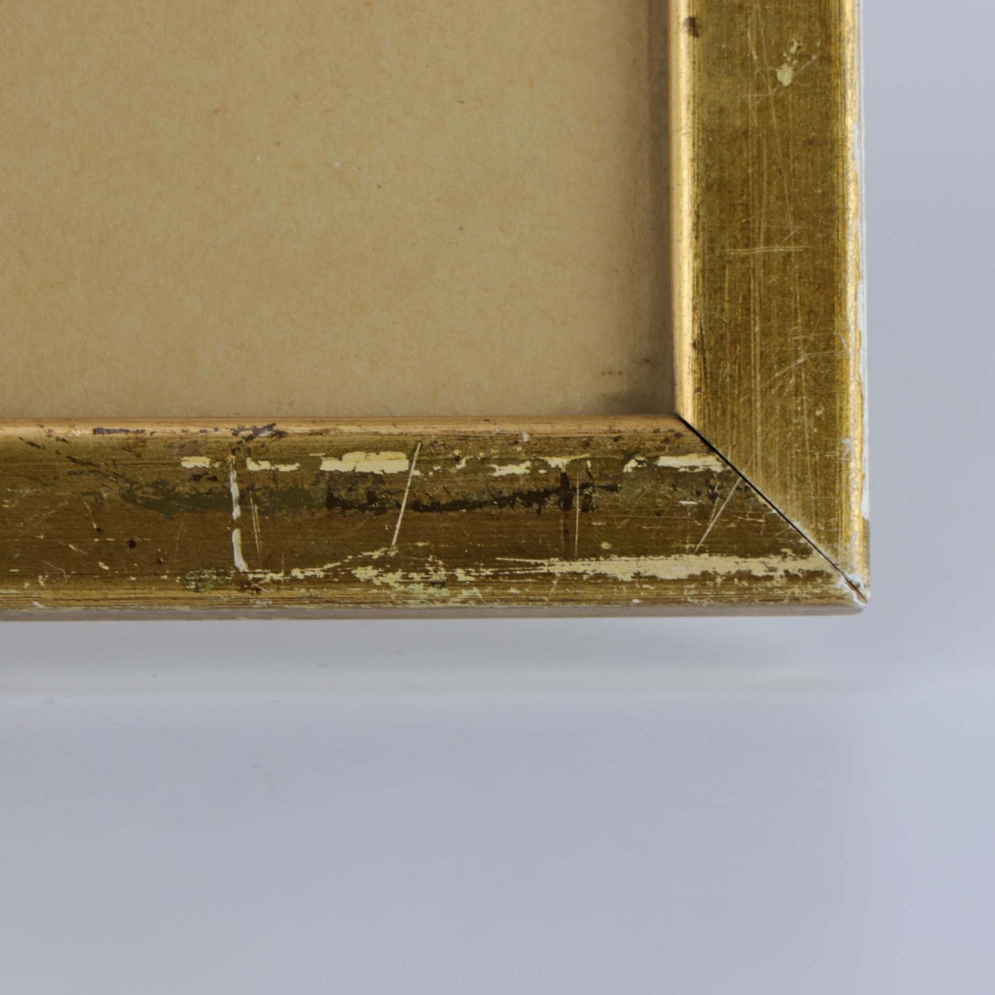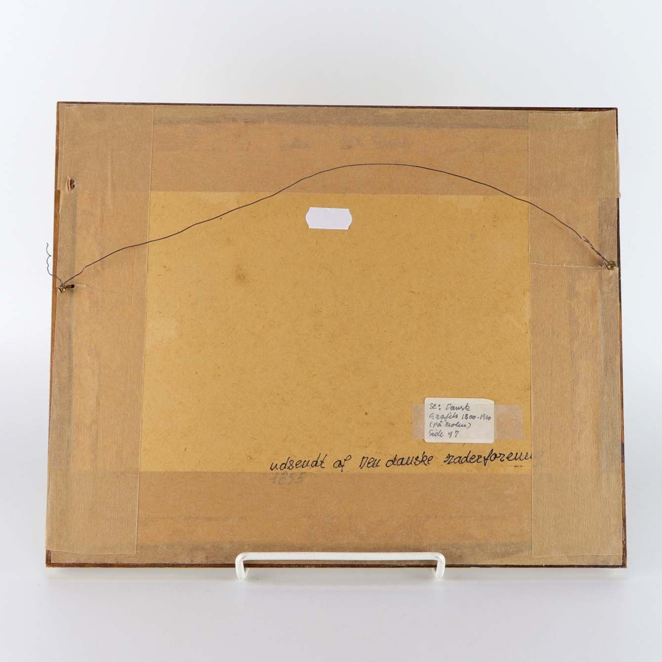 Indrammet antik radering på brunt papir med passepartout i guldmalet træramme og landskabsmotiv med udsigt fra sti.