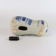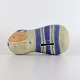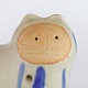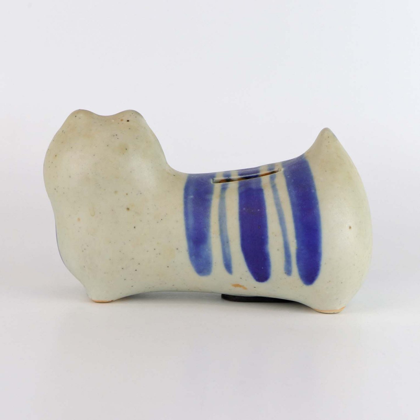 Sparebøsse i stentøj med motiv af blå og hvidstribet kat. Sparebøssen åbnes under bunden med lukning af sort gummi.