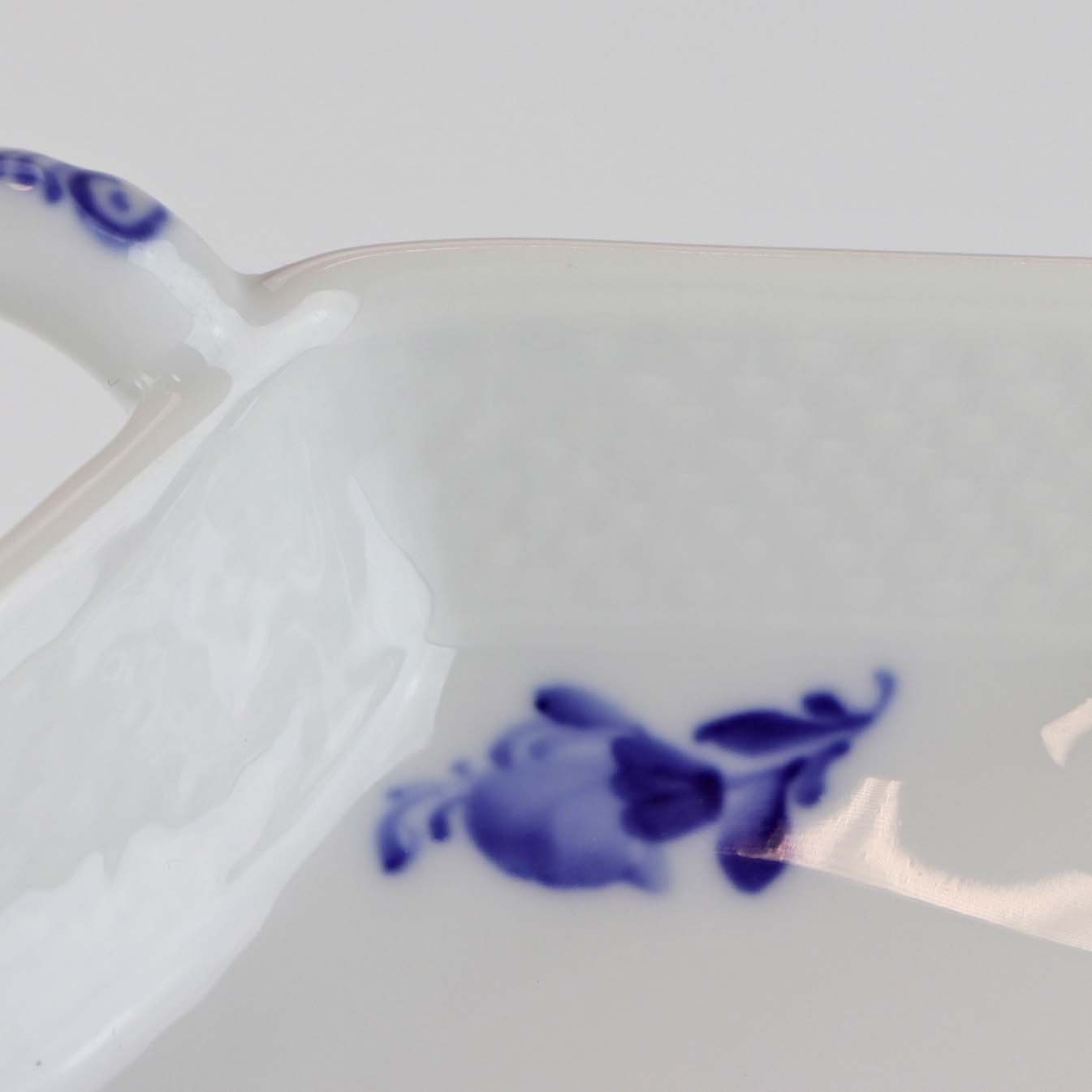 Kongelig bladformet kagefad i porcelæn med hank fra stellet Blå blomst flettet. Nr. 10/8003