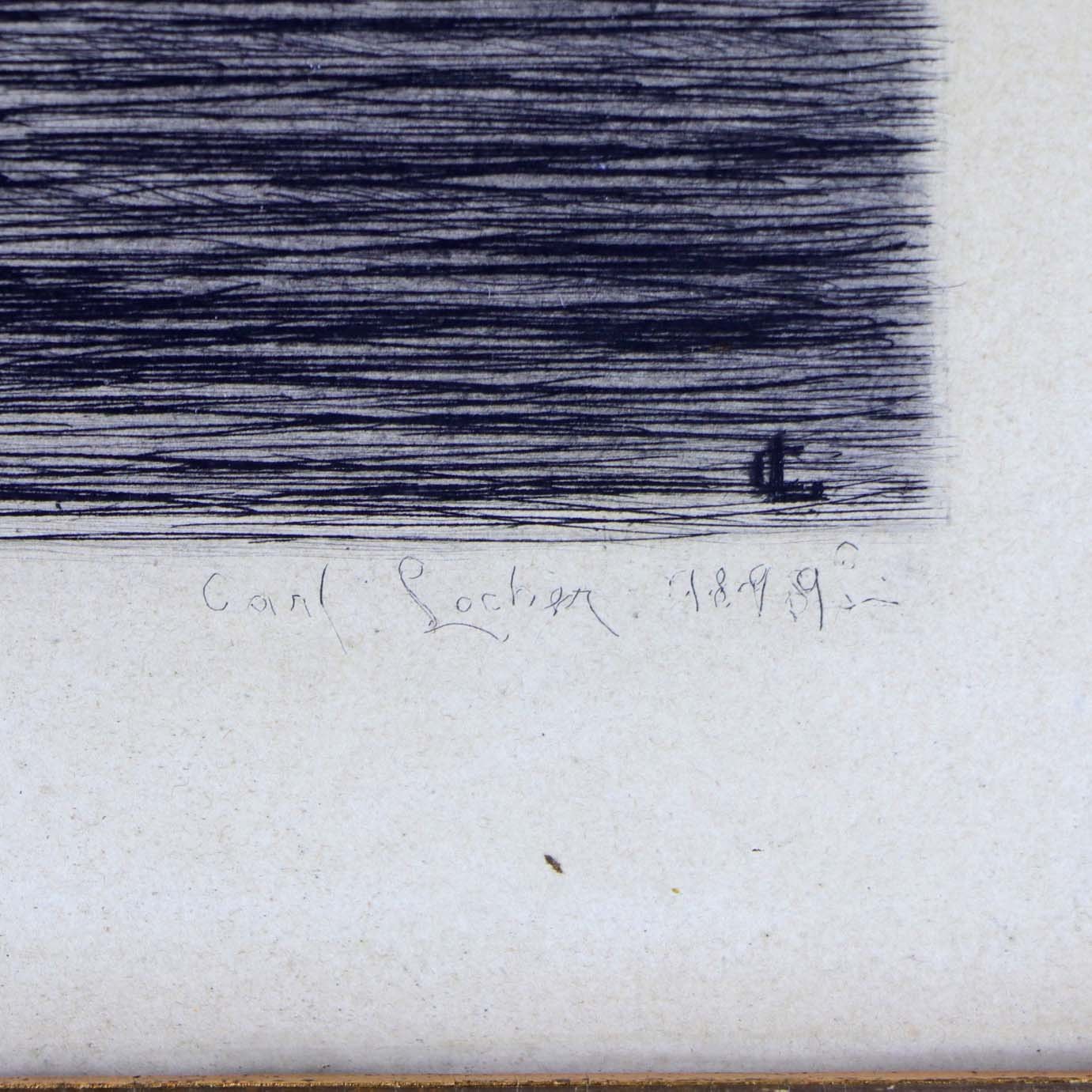 Indrammet radering i guldmalet træramme med landskabsmotiv af seljskib og båd på hav.