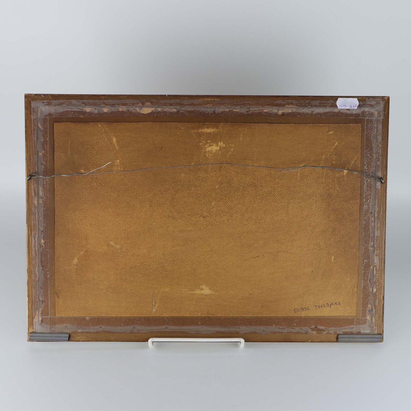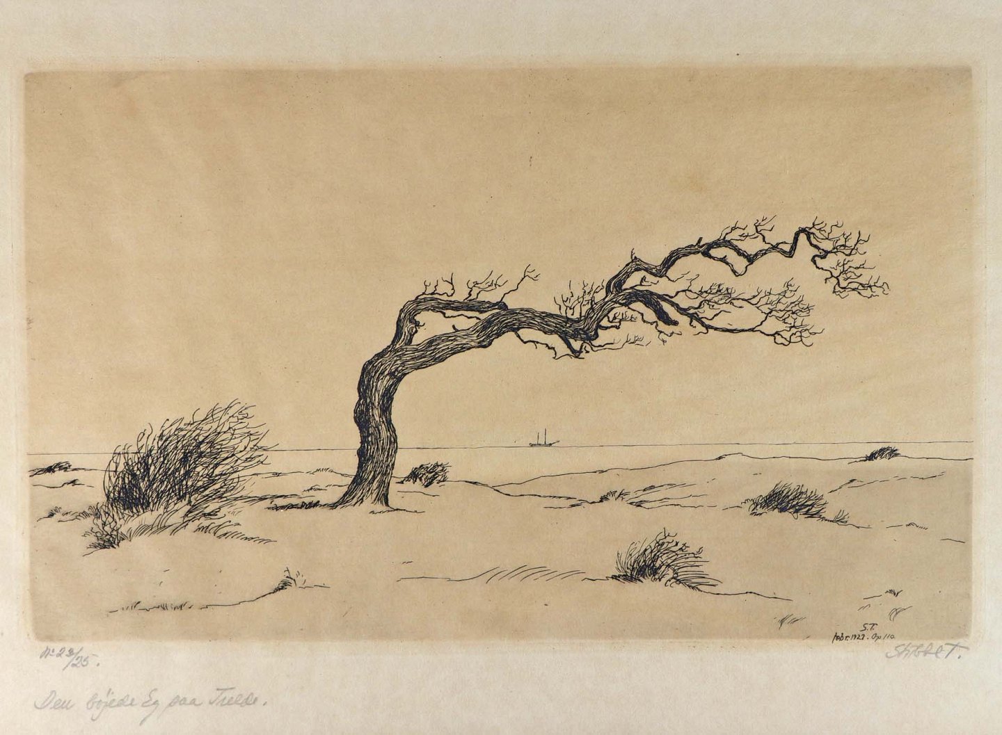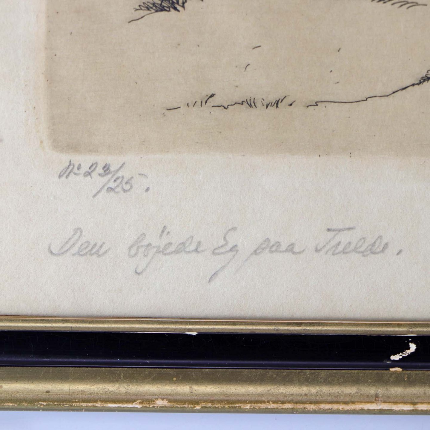Indrammet litografi i sort- og guldmalet træramme med landskabsmotiv med titlen Den bøjede eg på Trelde. Nr. 23 ud af 25 tryk.