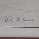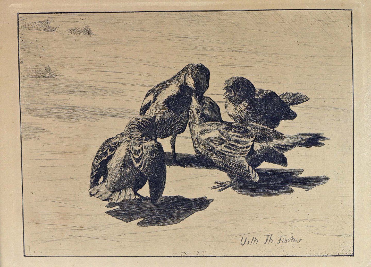 Indrammet radering på brunligt papir i træramme med motiv af fire gråspurve.