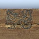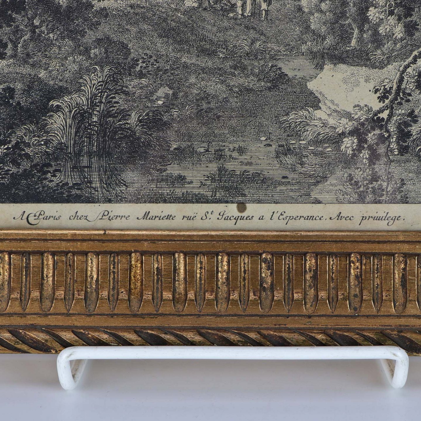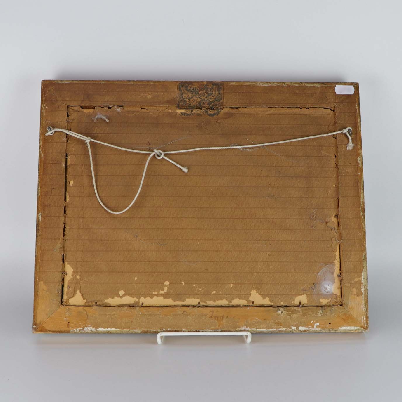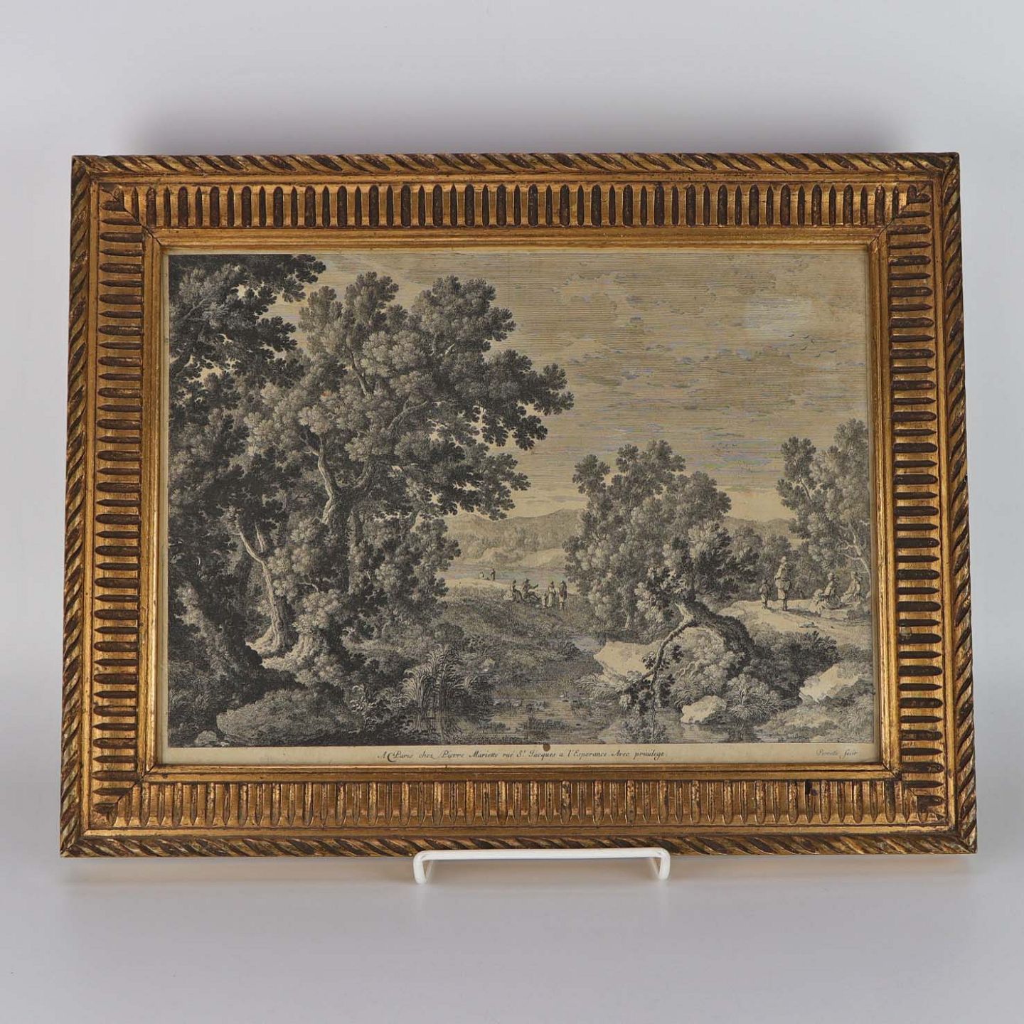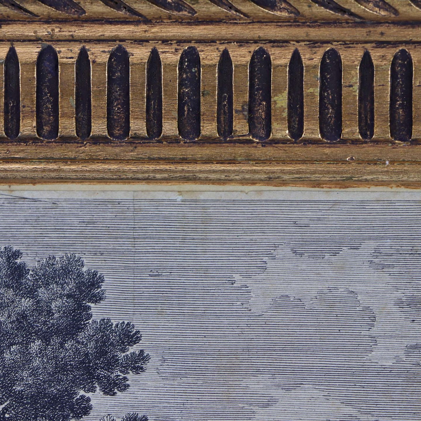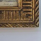 Indrammet bogtryk i guldmalet struktureret træramme med motiv af grupper af mennesker i landskabsområde.