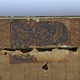 Indrammet bogtryk i guldmalet struktureret træramme med motiv af grupper af mennesker i klippeområde med udsigt til huse og flod.