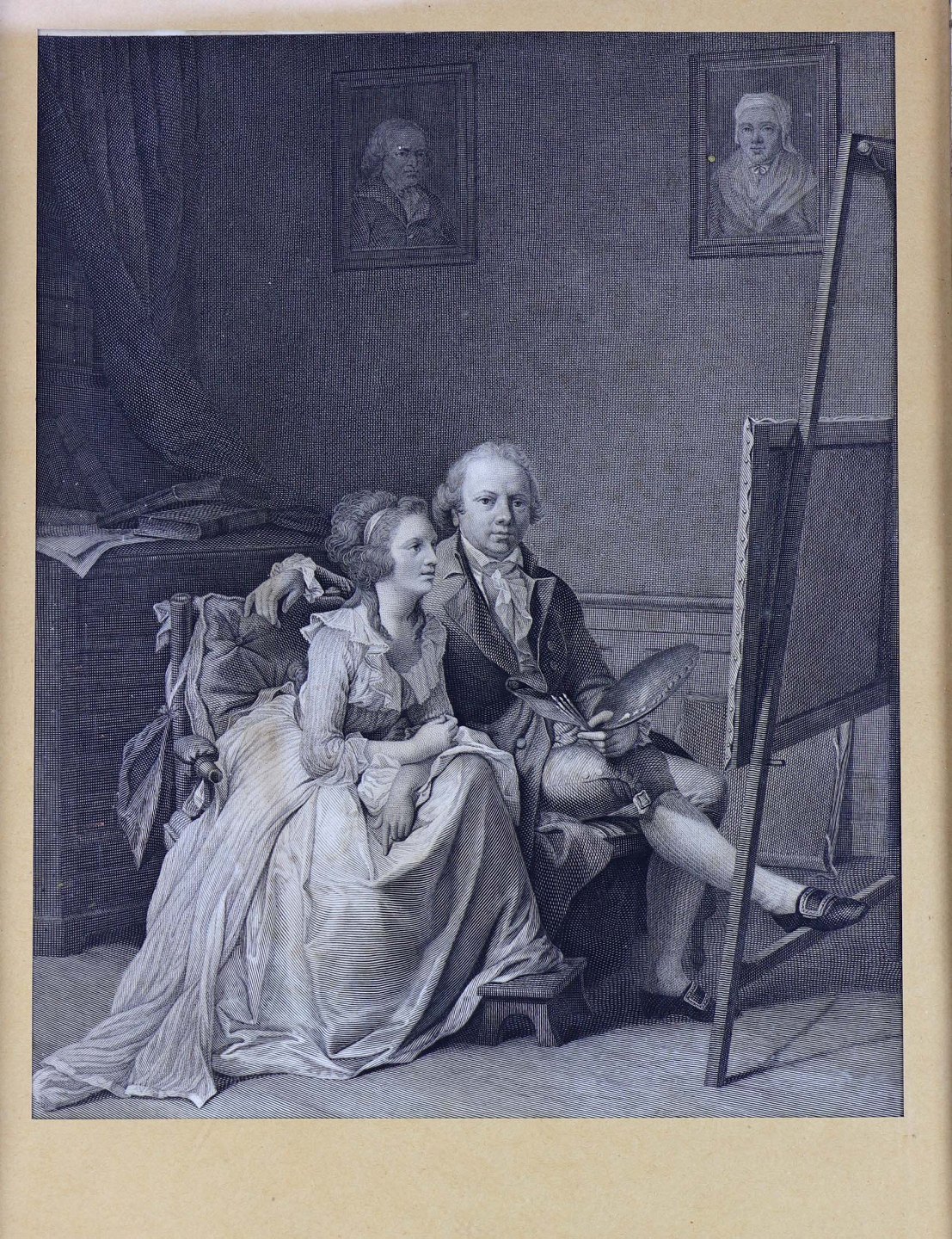 Indrammet kobberstik med passepartout i guldmalet træramme med motiv af den danske kunstmaler Jens Juel og hans kone ved staffeli
