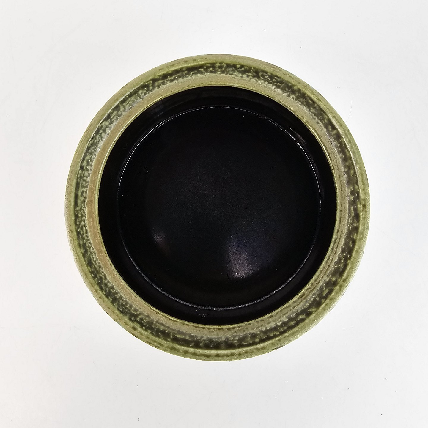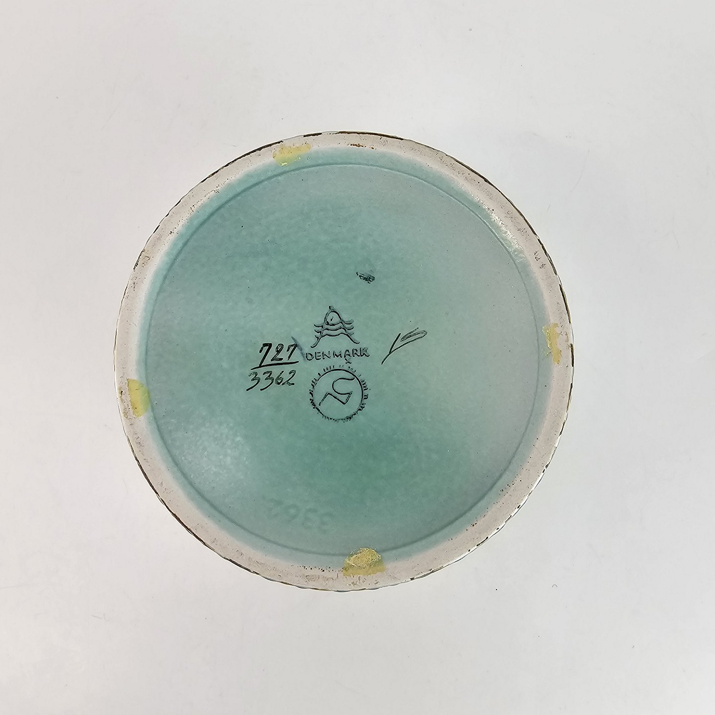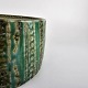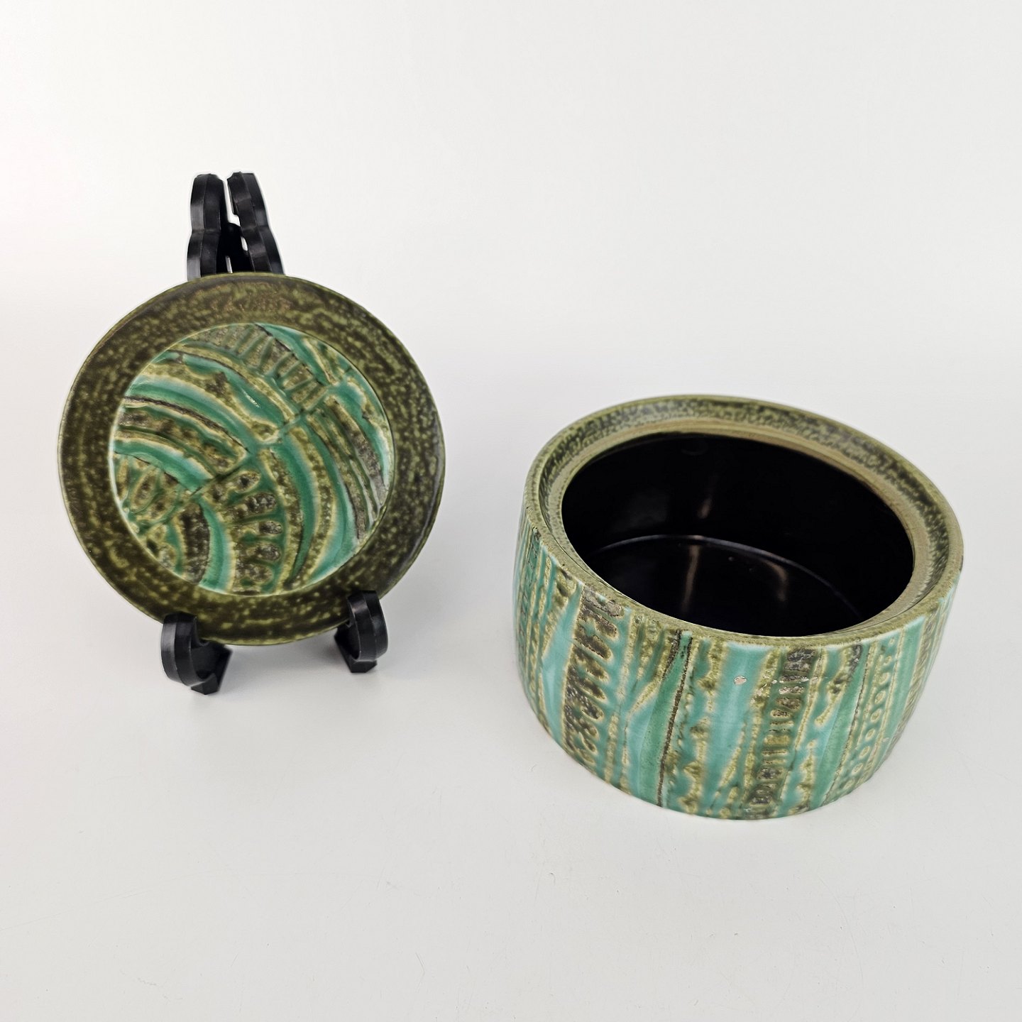 Lav rund krukke med låg i grønne nuancer, i fajance. Nr 727/3362