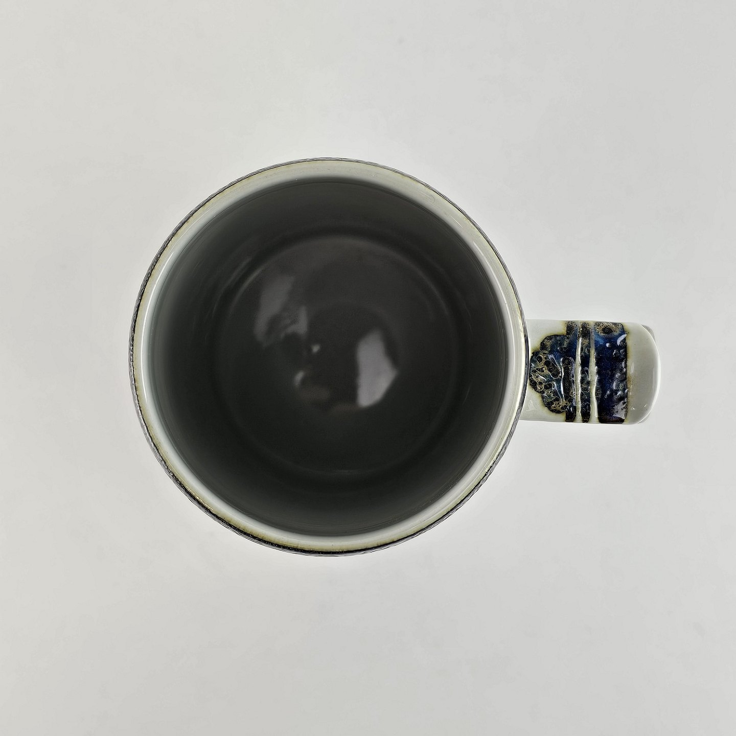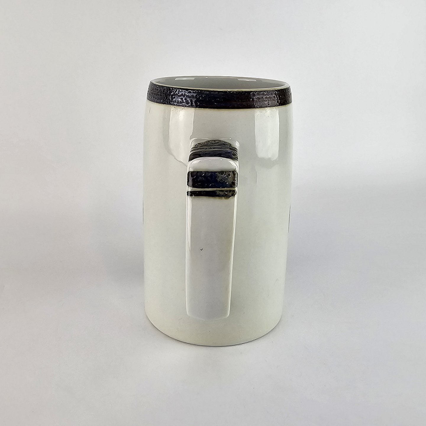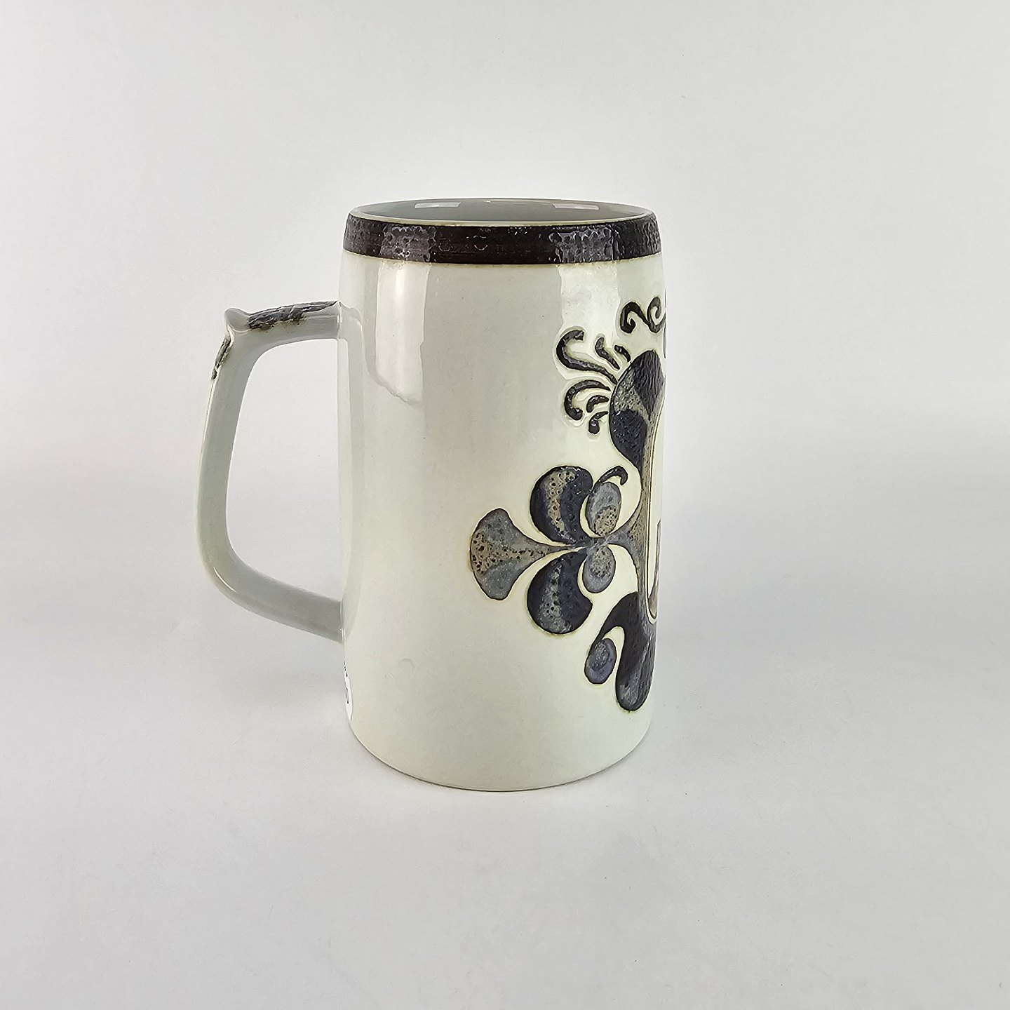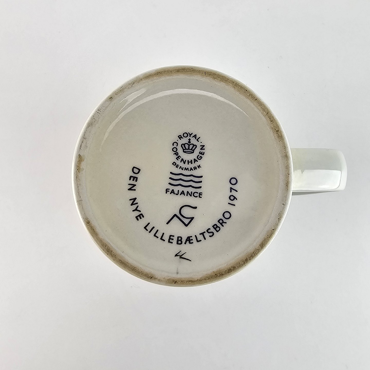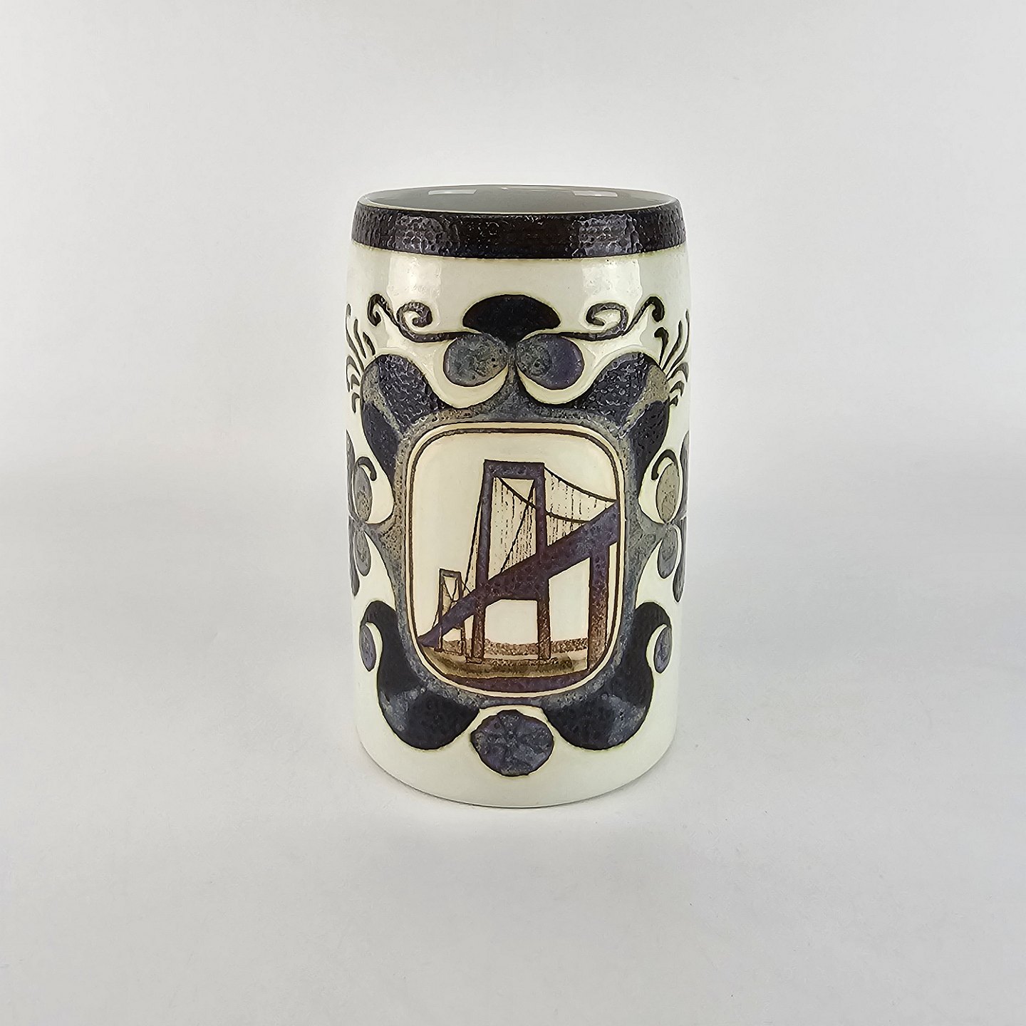 Krus af fajance med motiv af Den nye Lillebæltsbro i brune nuancer. År 1970.