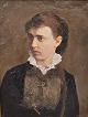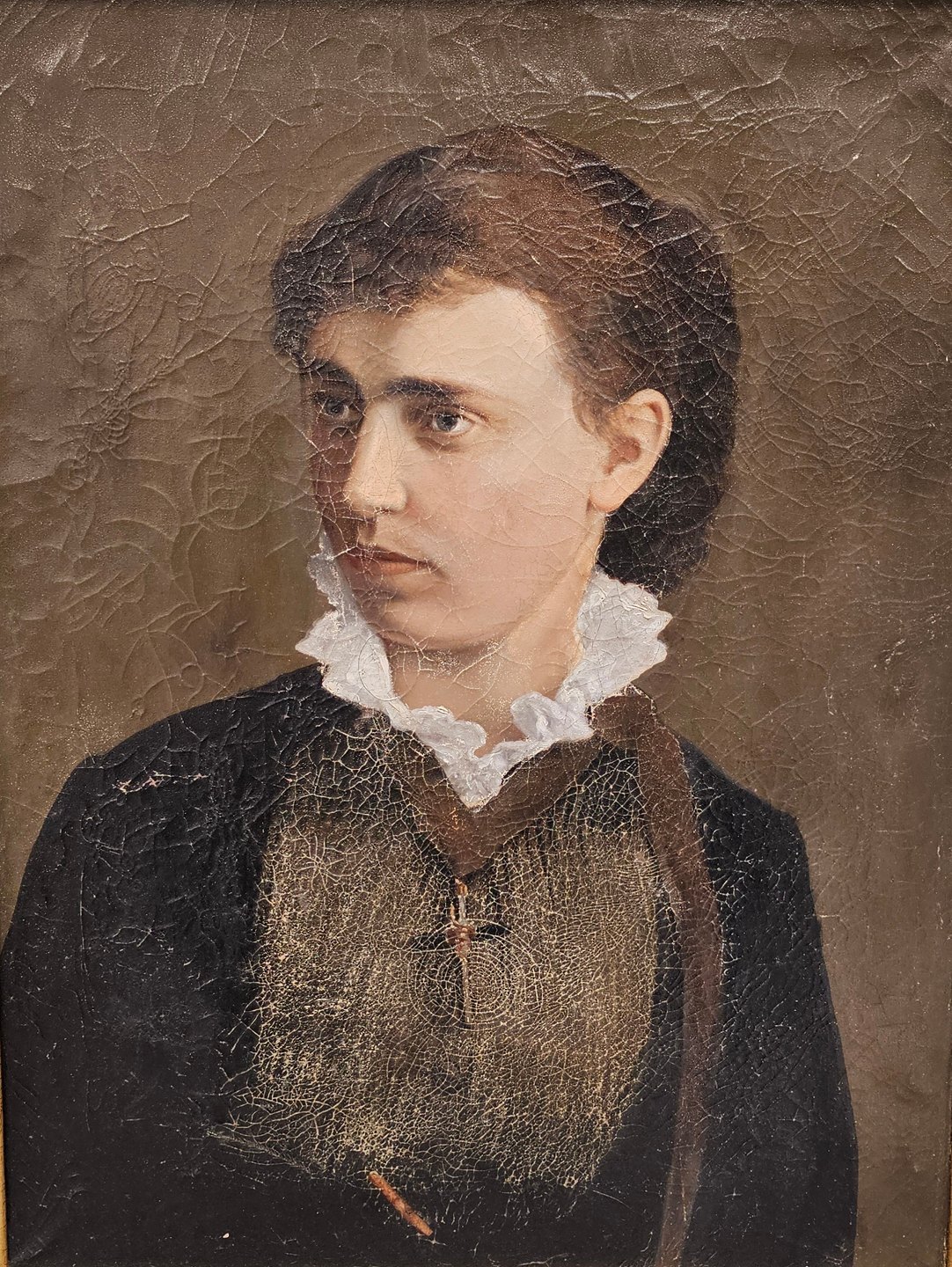Oliemaleri på lærred med et portræt af en sortklædt kvinde med opsat hår, hvid krave og en halskæde med et kors