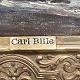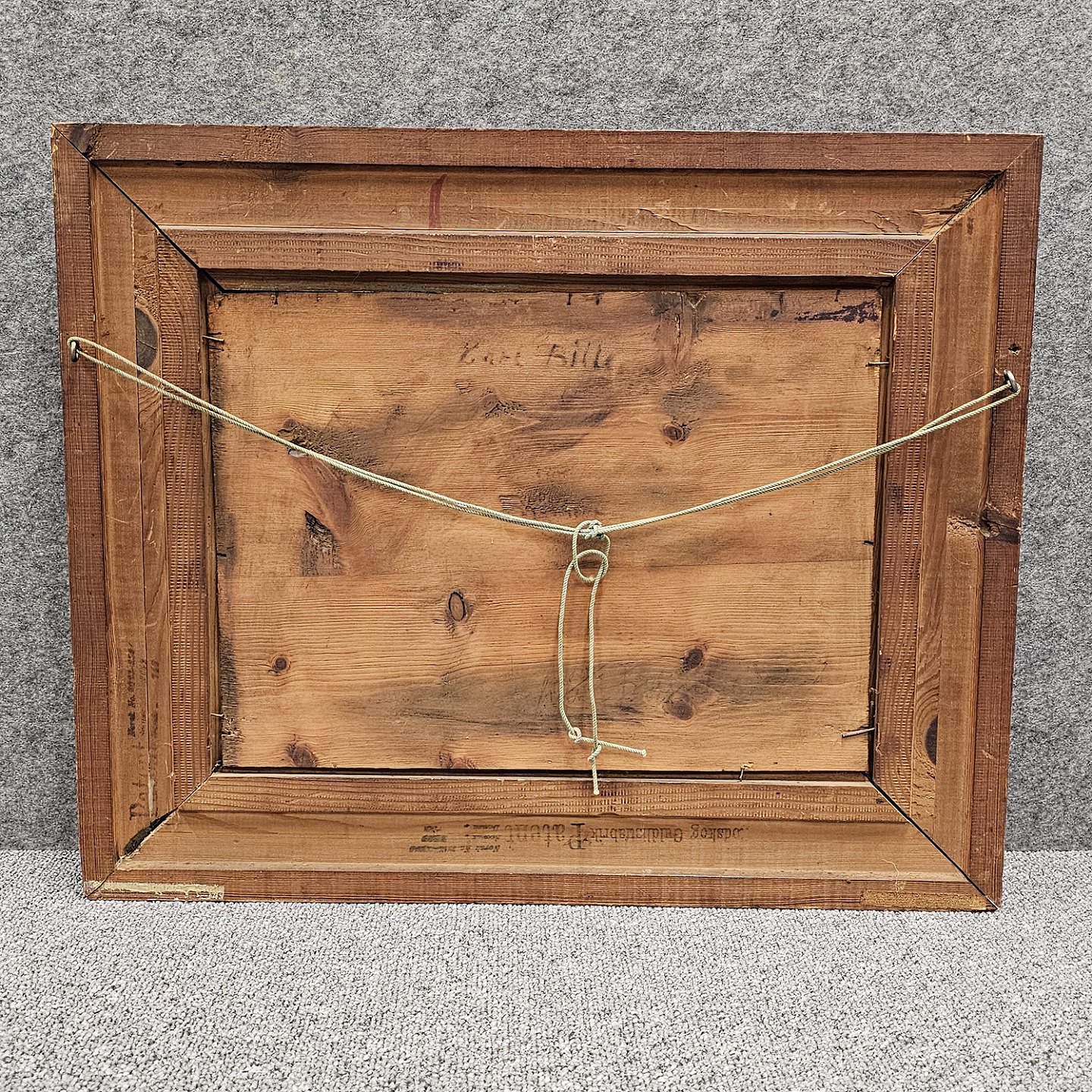 Oliemaleri på plade, med motiv af hav med et sejlskib. På rammen sidder et skilt med teksten Carl Bille