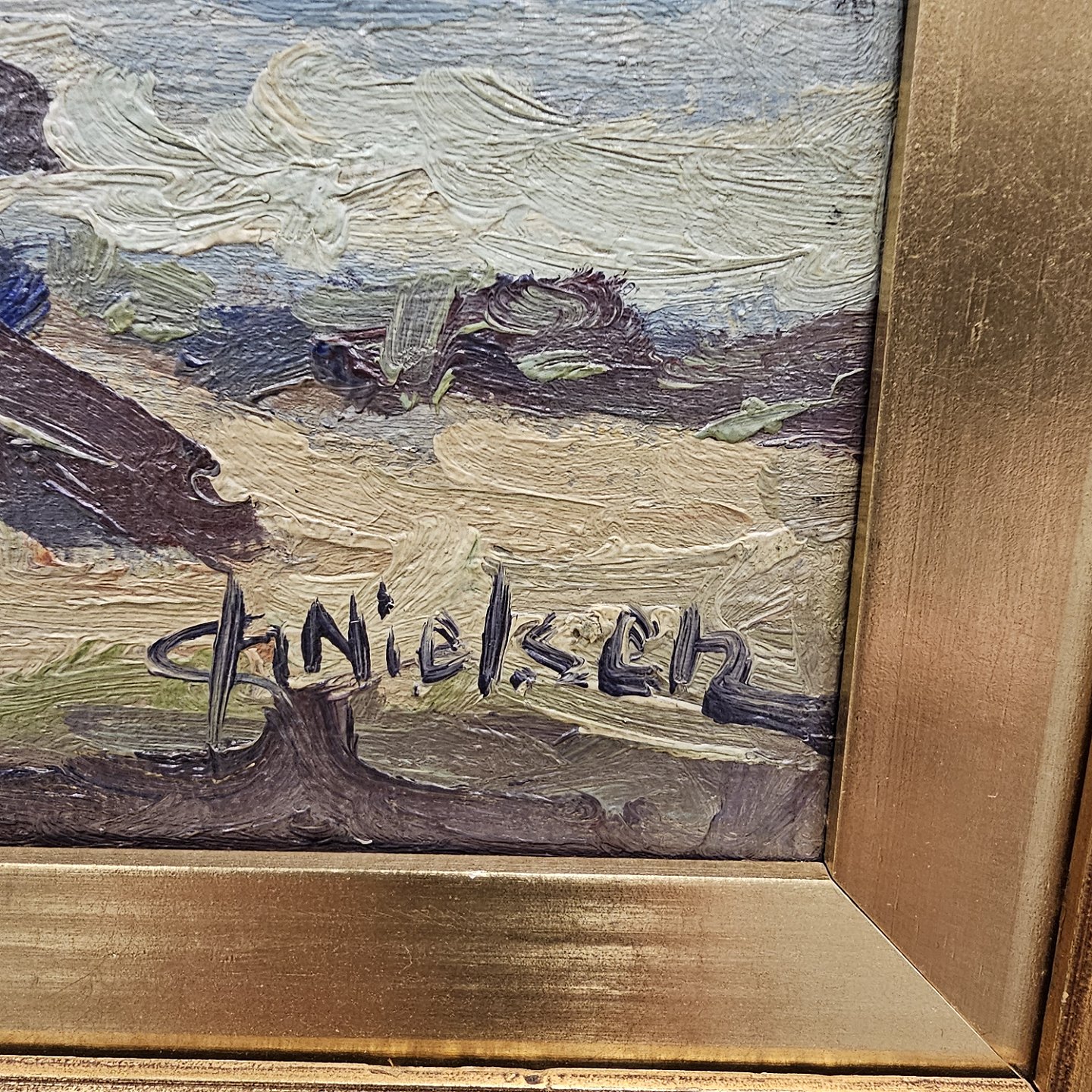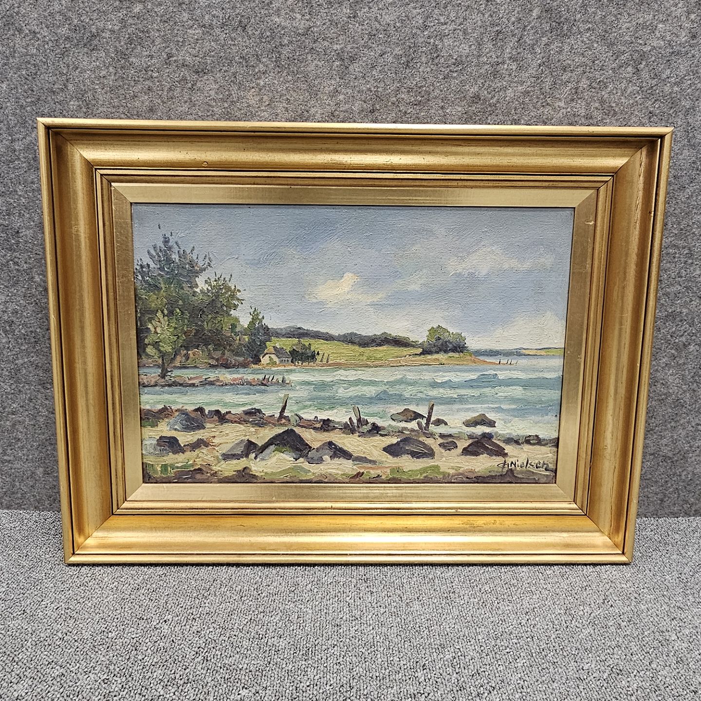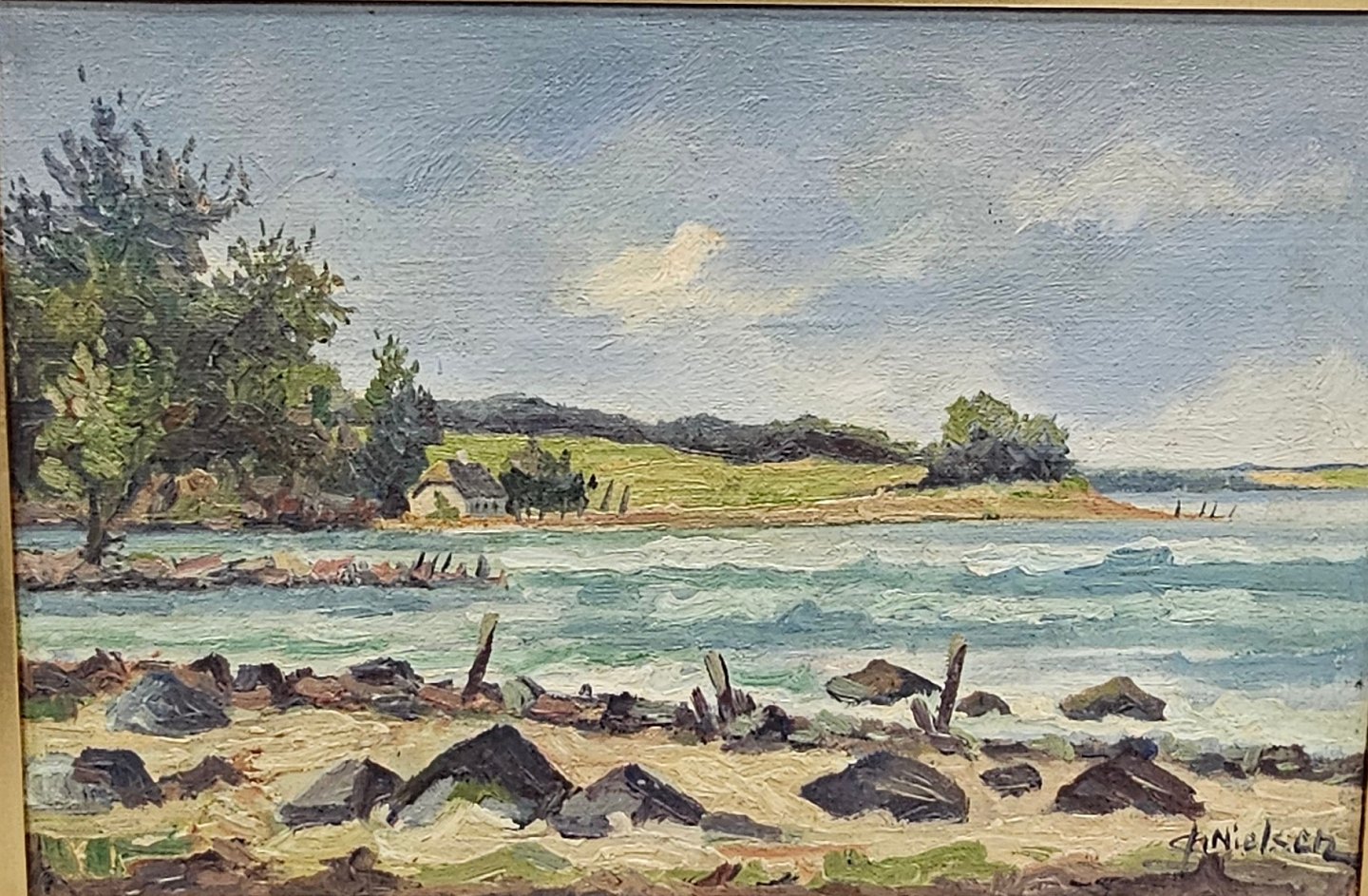 Oliemaleri på lærred, med motiv af en strandkant.