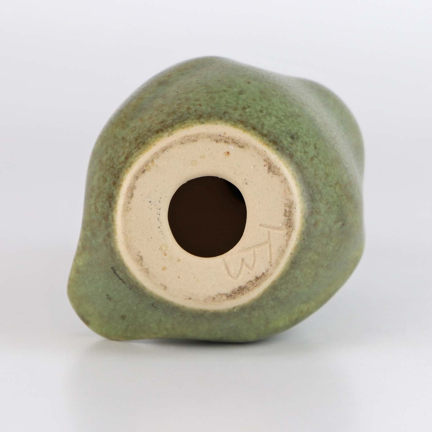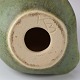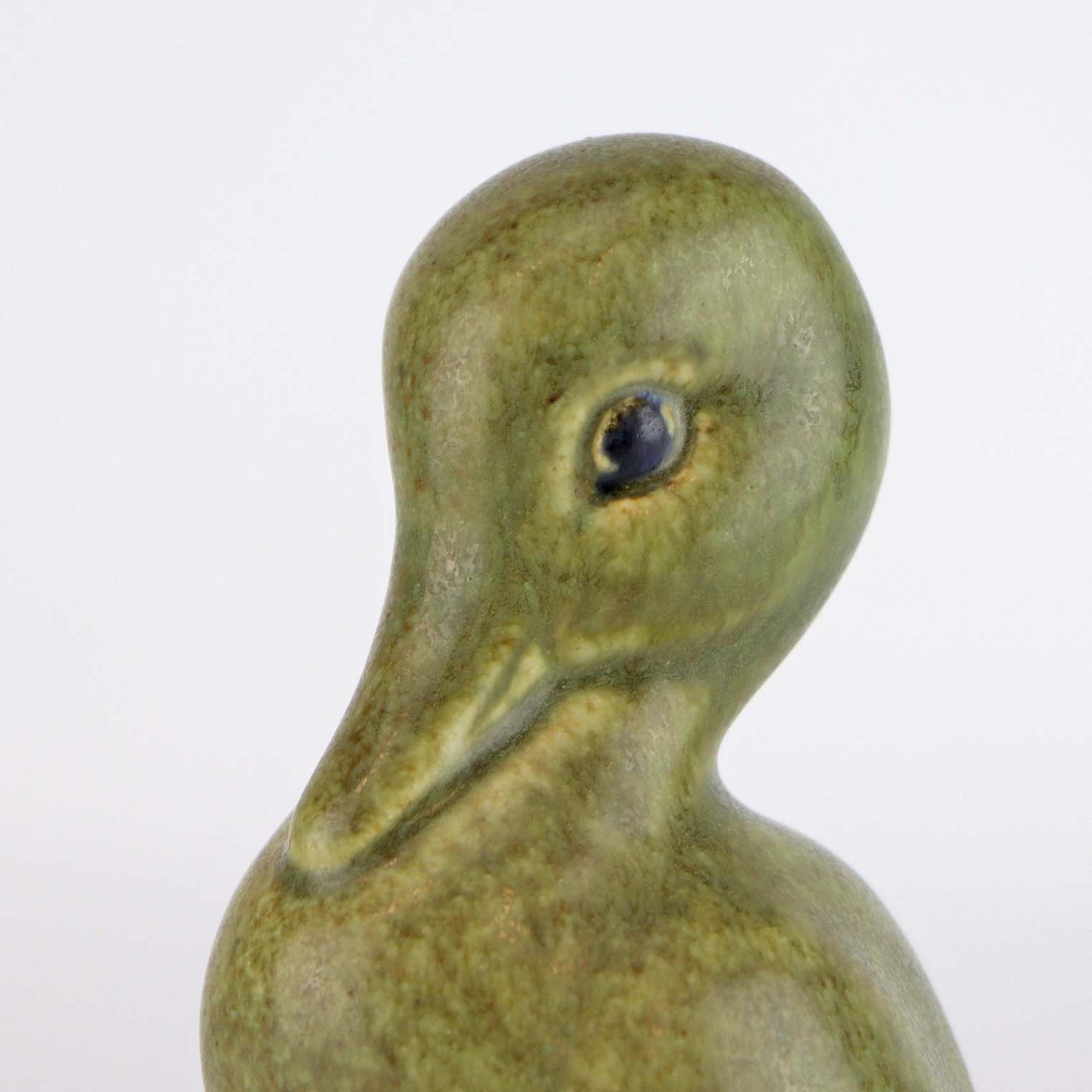 Figur i stentøj med grøn glasir og motiv af en ælling.