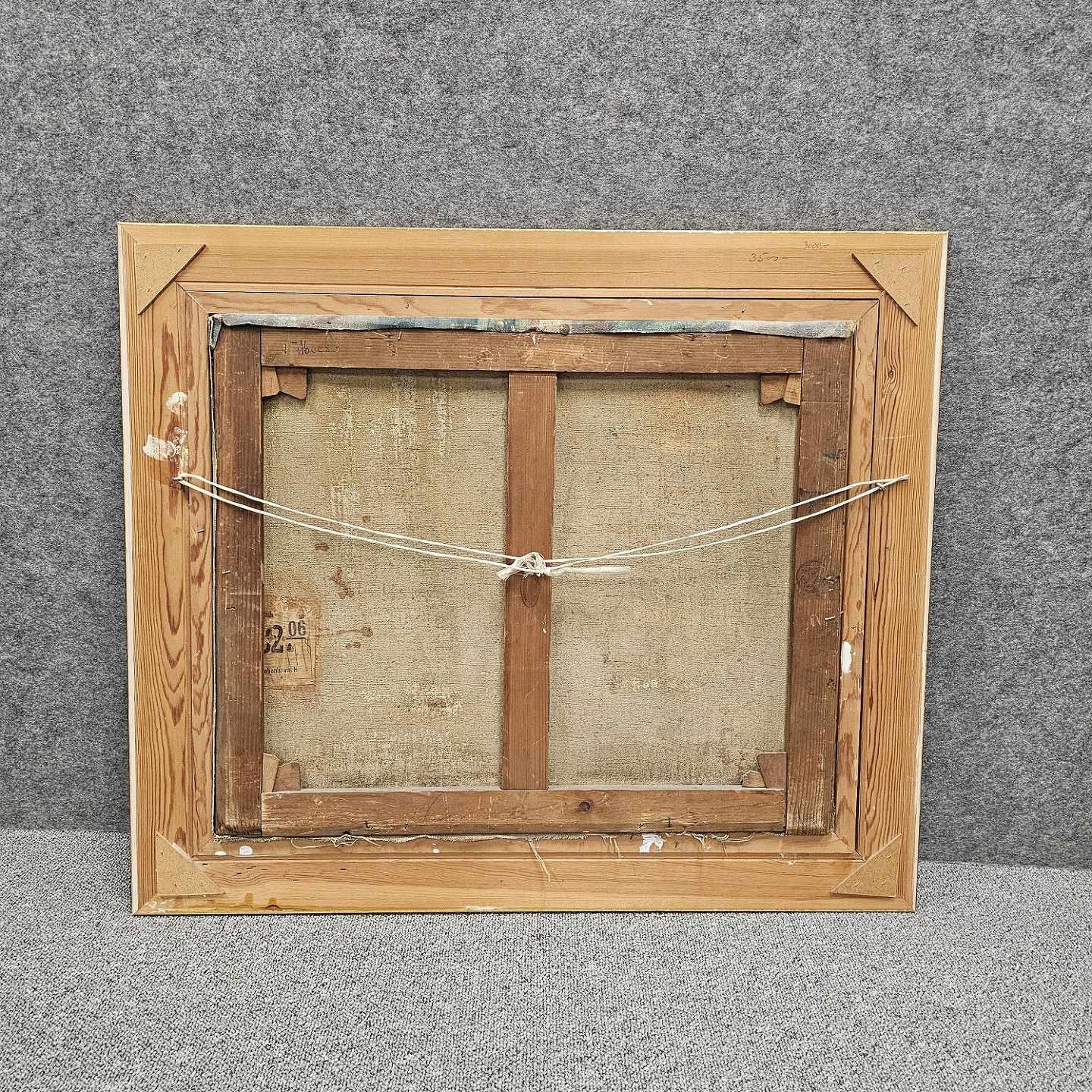 Oliemaleri på lærred, sat i guldramme, med motiv af huse og træer uden blade.