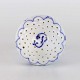 Musselmalet er af kongeligt hvidt porcelæn, dekoreret med rifler og mønster af blå ranker og blomster
