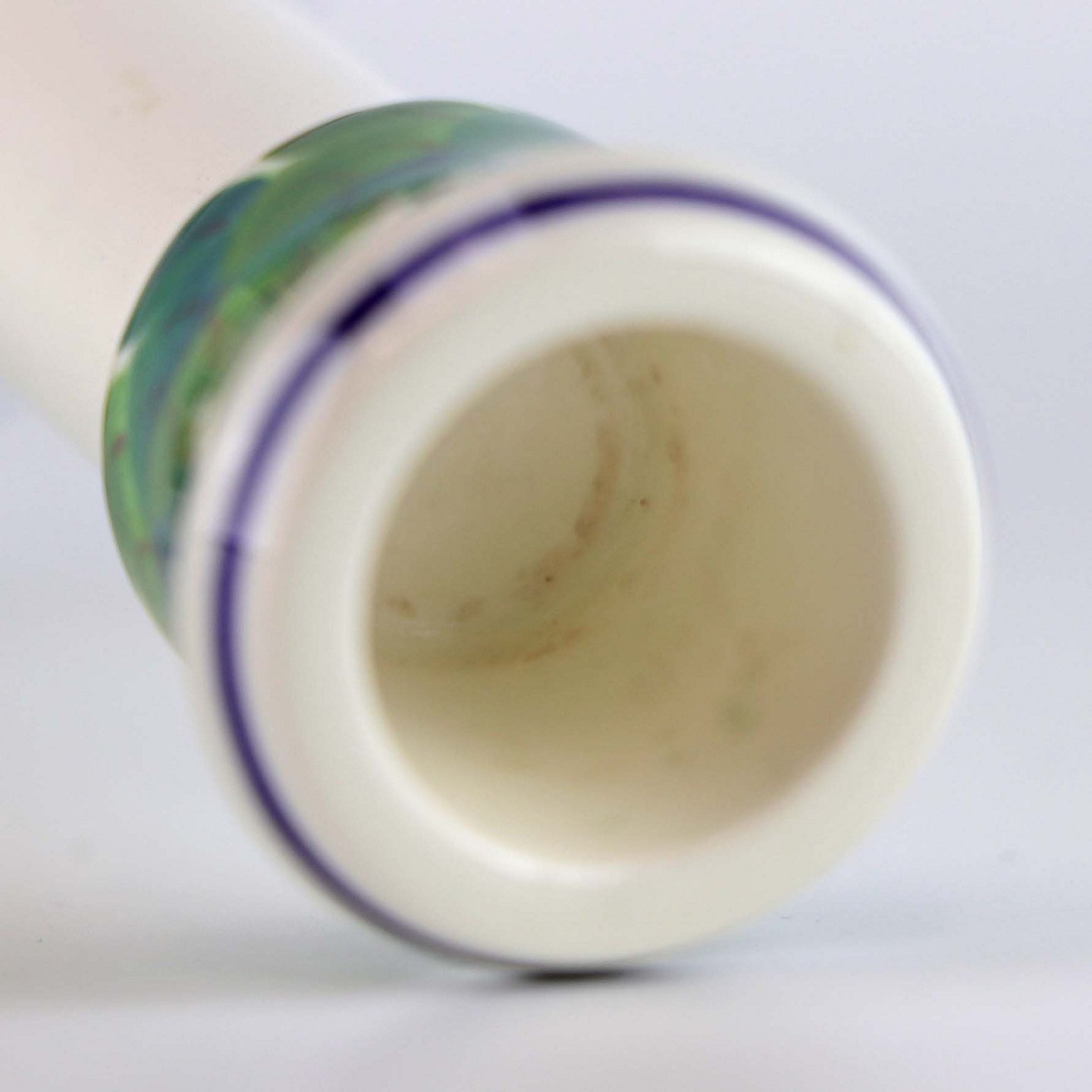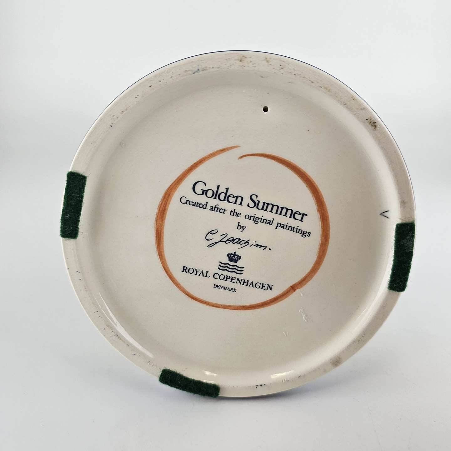 Tallerken i glat hvidt porcelæn med blå kant og dekoreret med sommerblomster og frugter