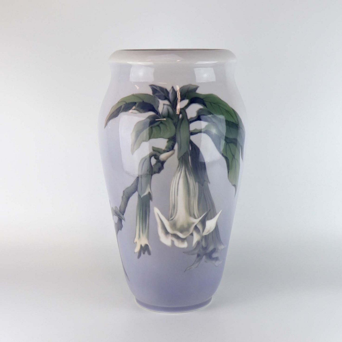 Kongelig gulvvase i porcelæn med motiv af hvide trompetblomster på gradueret blå baggrund. Nr. 2687/1216