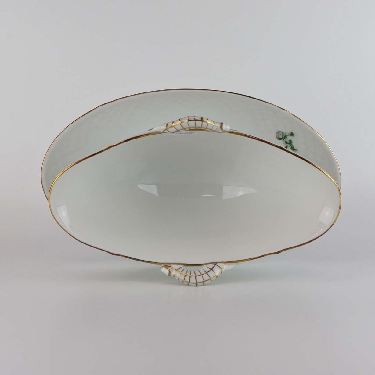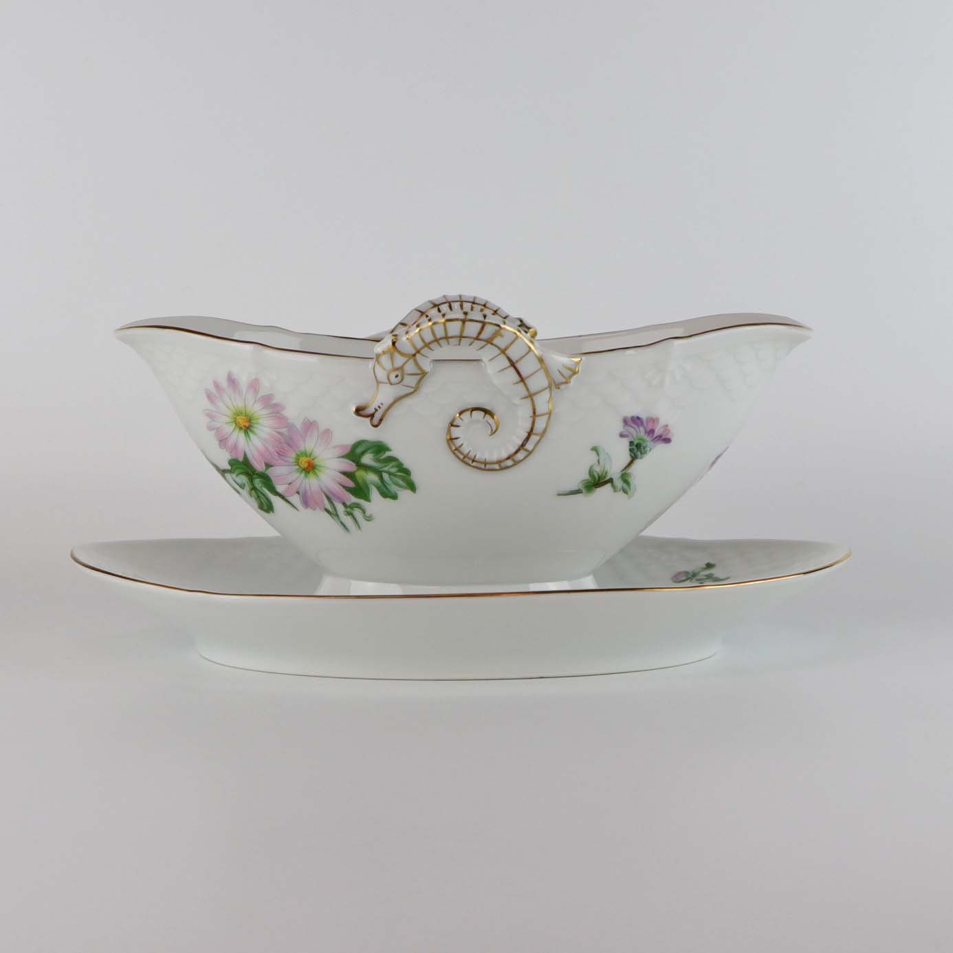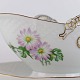 Stellet Krysantemum er af hvidt porcelæn, dekoreret med lys lilla blomst, grønne blade og guldfarvet kant.