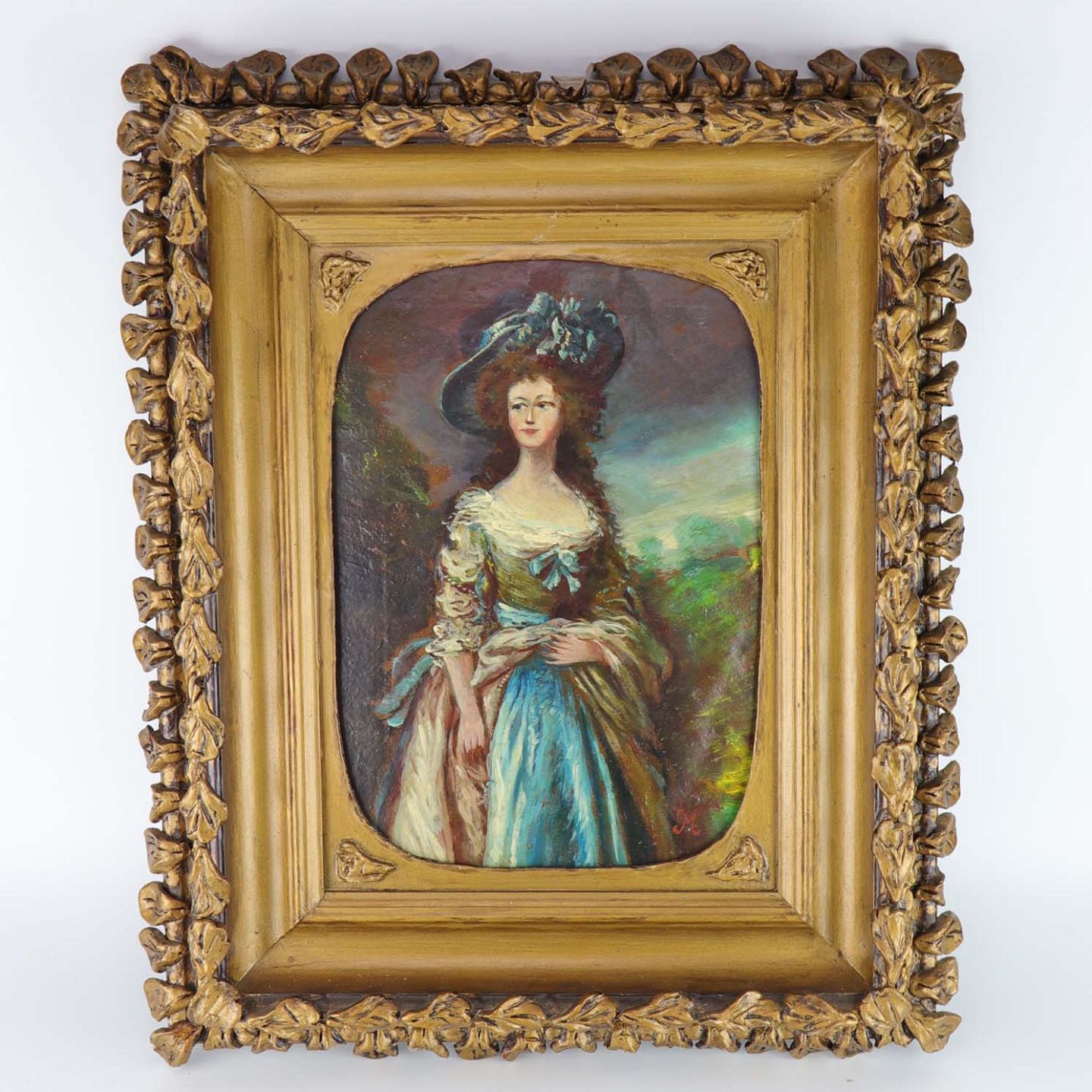 Gammel maleri på plade i malet gipsramme. Reproduktion af Thomas Gainsborough's portræt af Sophia Charlotte Digby, Lady Sheffield