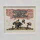 Tre små linoliumssnit i skifteramme, med forskellige motiver. Del af et sæt.