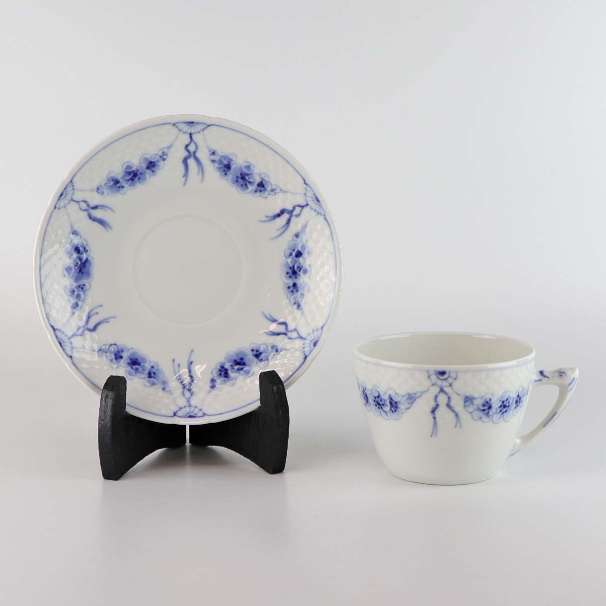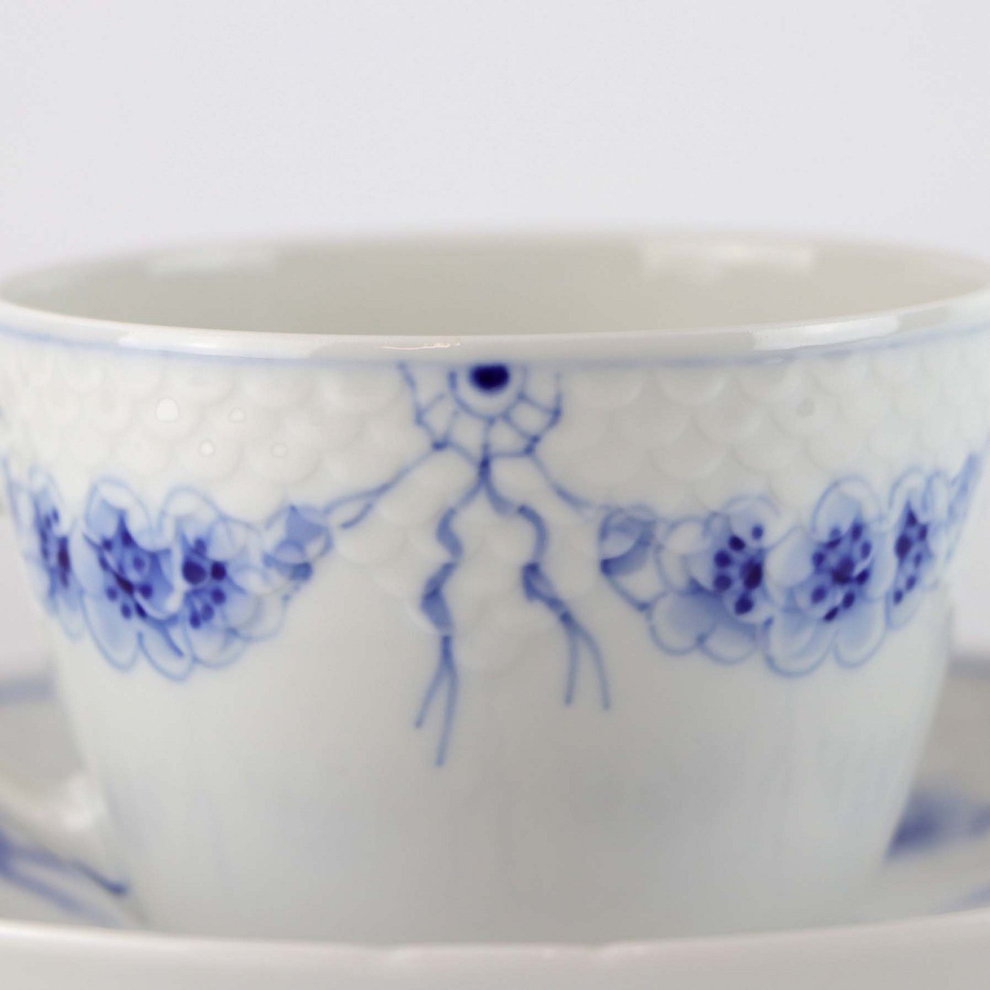 Service i hvidt porcelæn med skelform og motiv af guirlander med blå blomster.