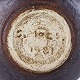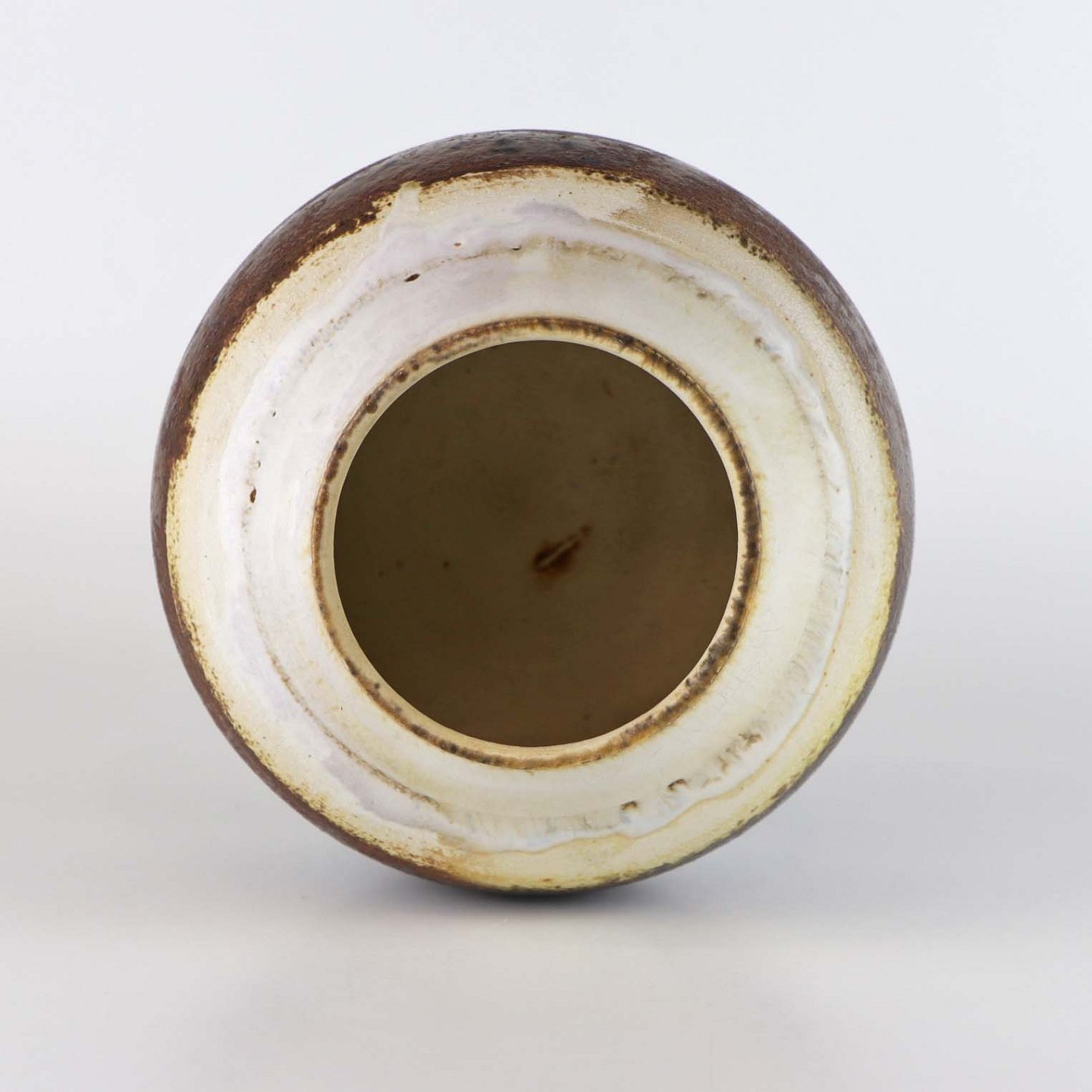 Rund vase i keramik med brun og lys glasur fra år 1981. Vasen har lys glasur på indvendig side.