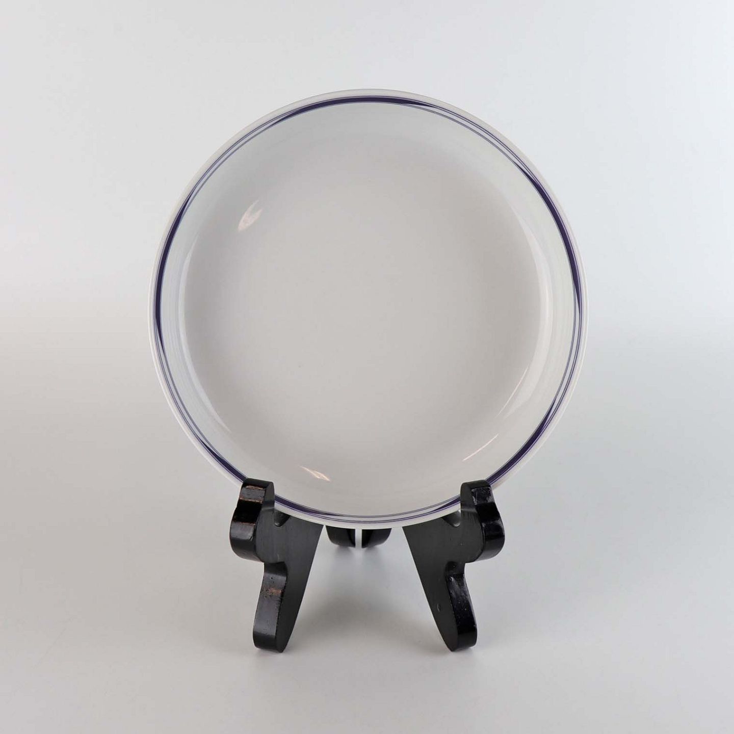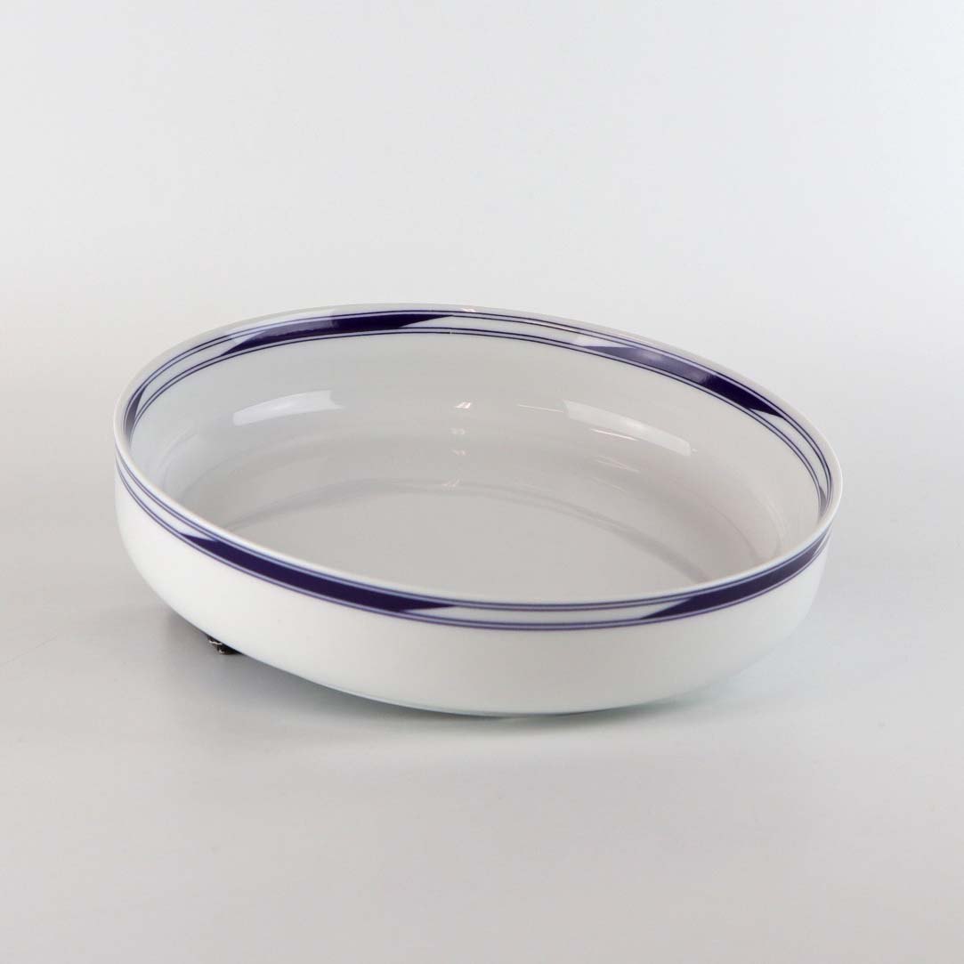Stel i glat hvidt porcelæn med geometrisk dekoration i mørkeblå streg langs kanten.